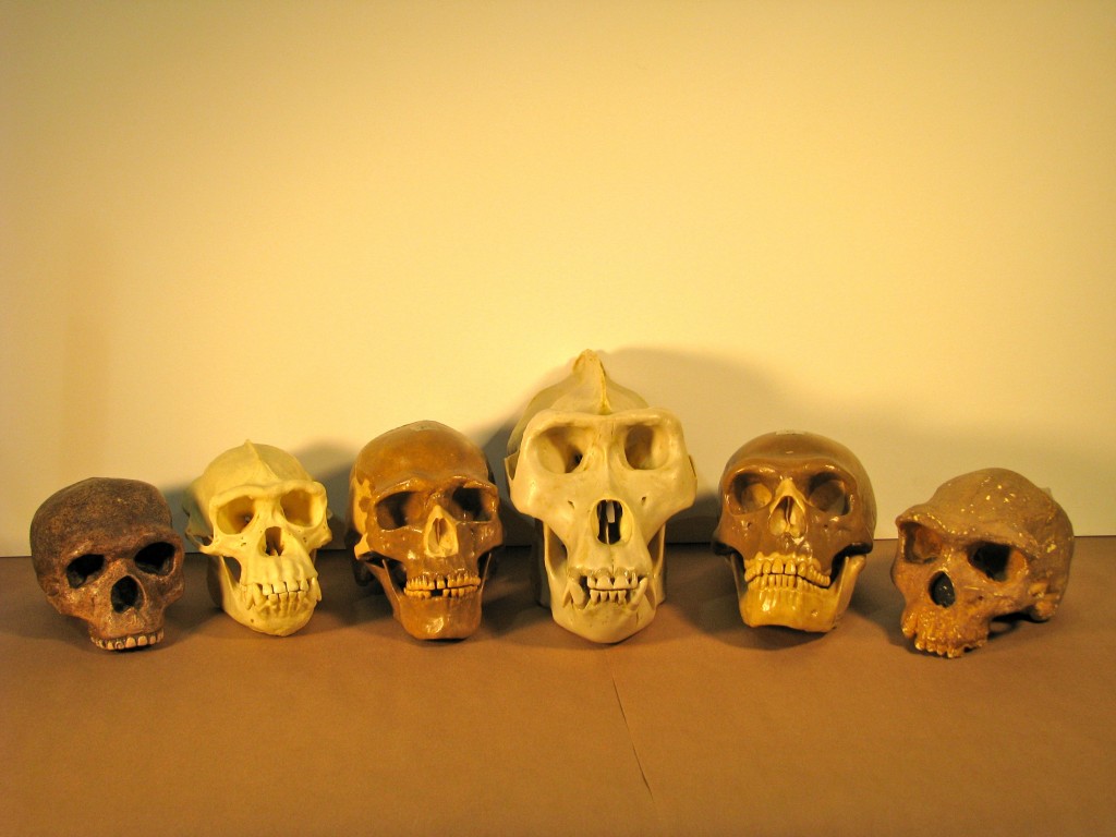 Na snímky jsou lebky šimpanze, gorily, člověka a tří vymřelých příbuzných z lidské linie