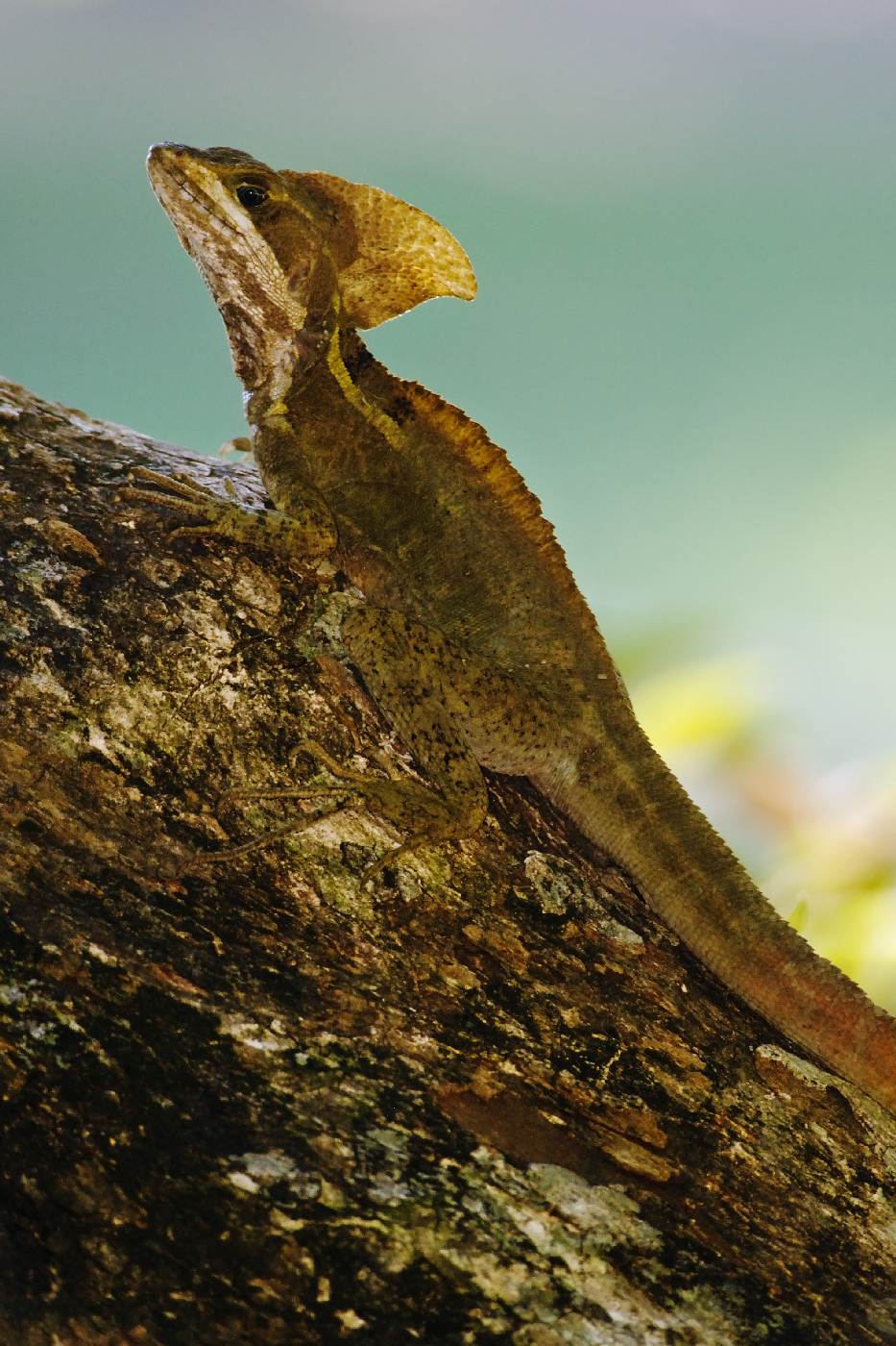 Bazilišek páskovaný je v přirozeném prostředí dokonale maskovaný. Své teritorium si naštěstí hájí pohazováním hlavy a díky tomu jsem si jej všiml