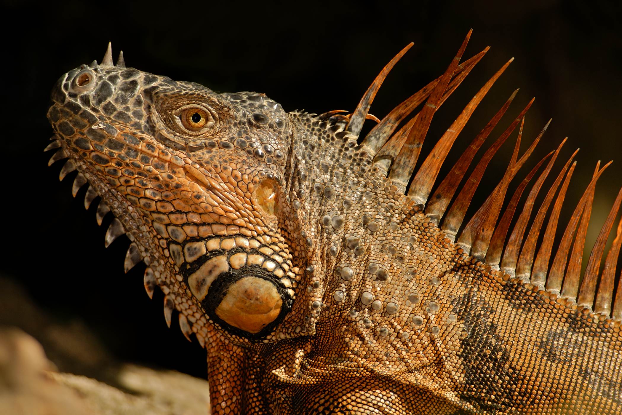 Portrét dospělého samce leguána zeleného s typickým zbarvení belizské formy