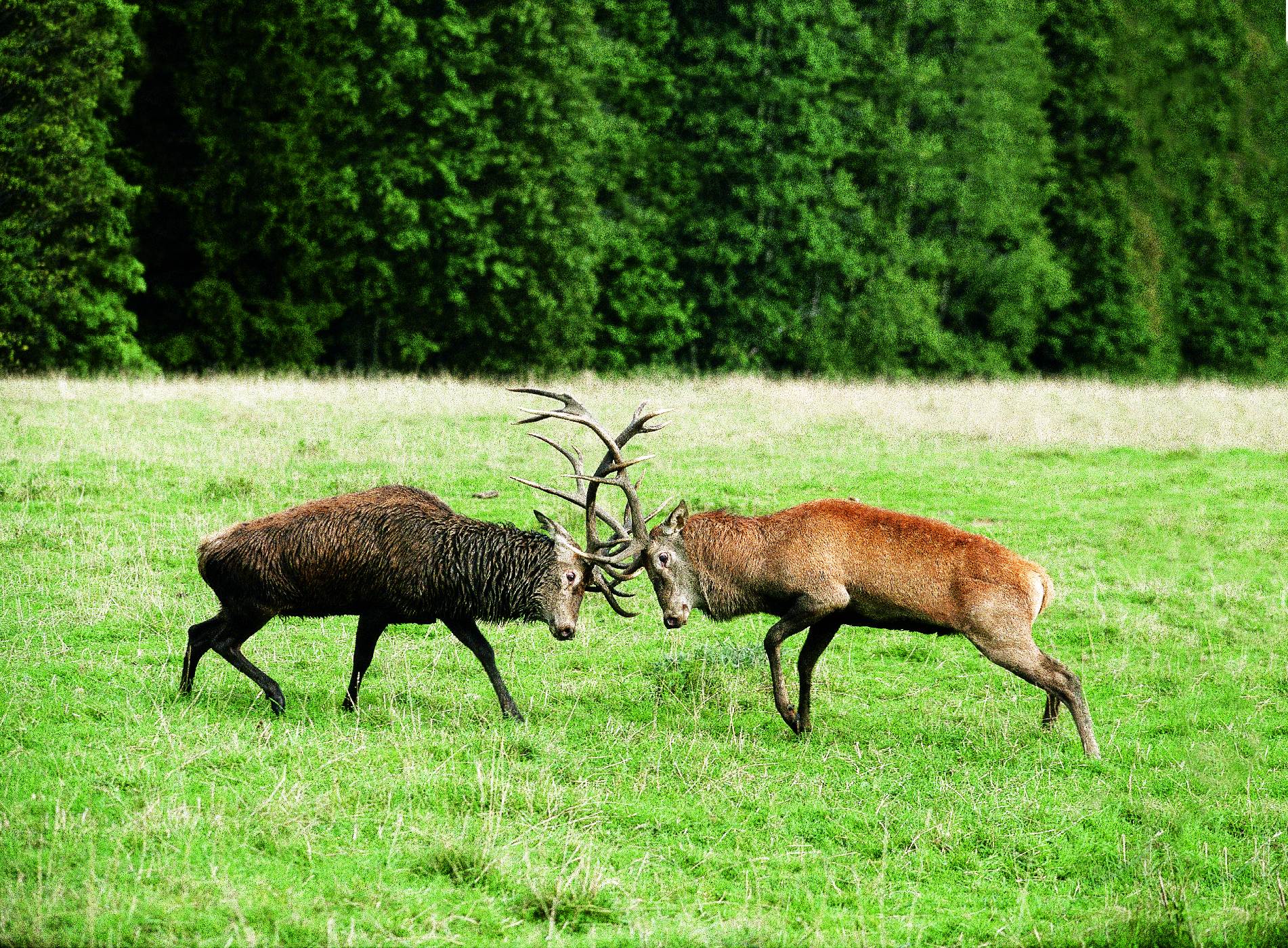• V případě, že se sejdou dva stejně silní jeleni a nepomohly výhrůžky varovného troubení, dochází mezi soupeři k souboji. Během souboje do sebe soupeři zaklesnou paroží a přetlačují se. Kroutí hlavami a jeden druhého se snaží povalit na zem, aby mu potom mohl zasadit ránu svým parožím. (foto: Jaromír Zumr - se souhlasem k publikování)