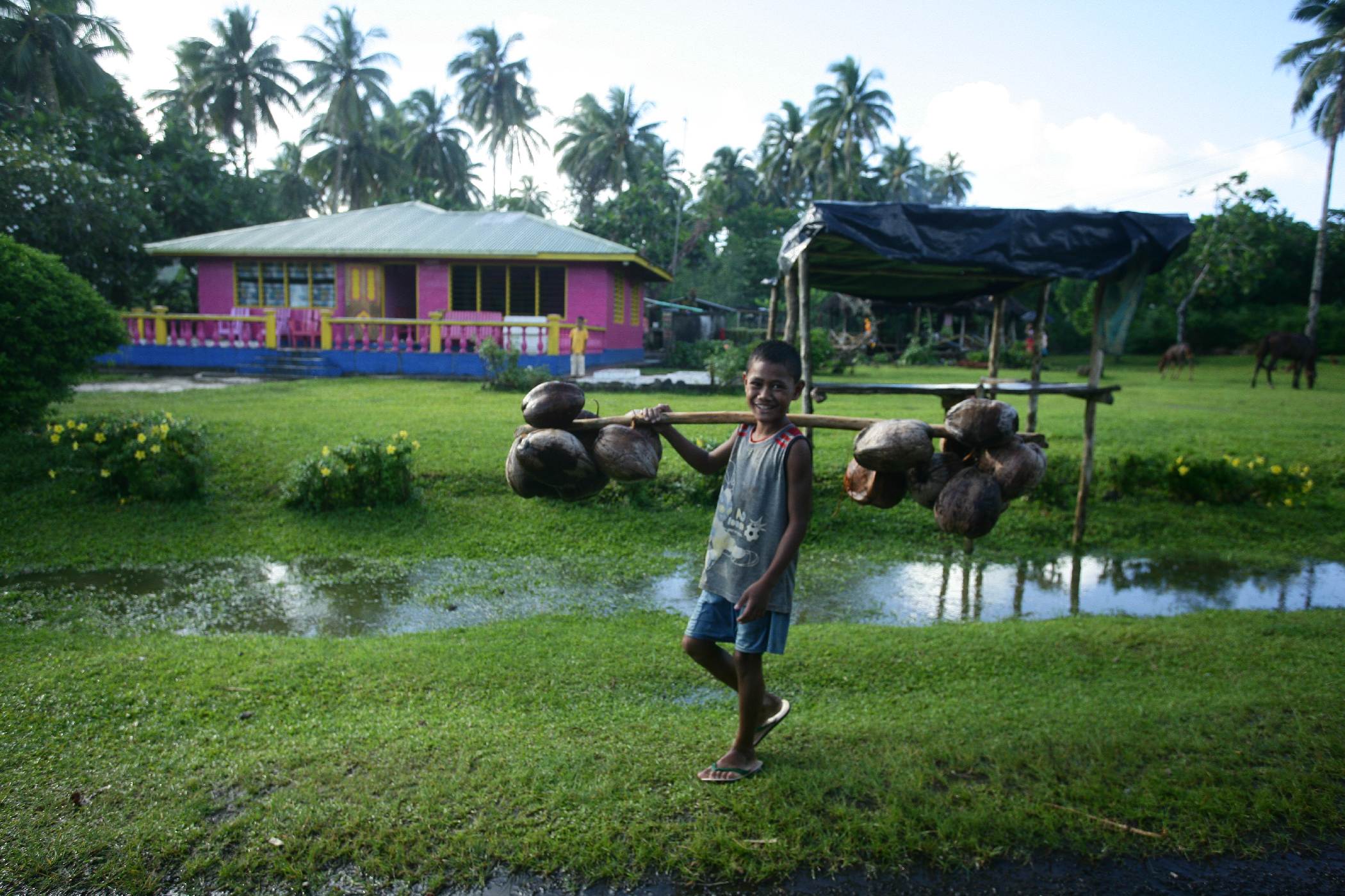 Děti se zapojují do práce ve velmi raném věku a takovýto náklad kokosů nosí i několik kilometrů daleko