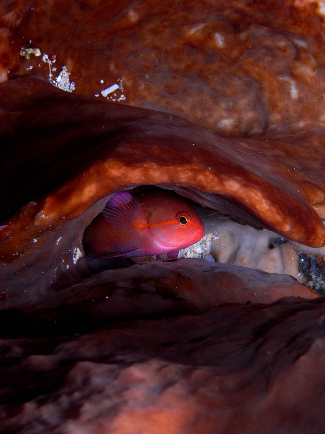 Drobná korálová rybka bradáč Pseudanthias squamipinnis je ve velkých hejnech po celém zdejším útesu