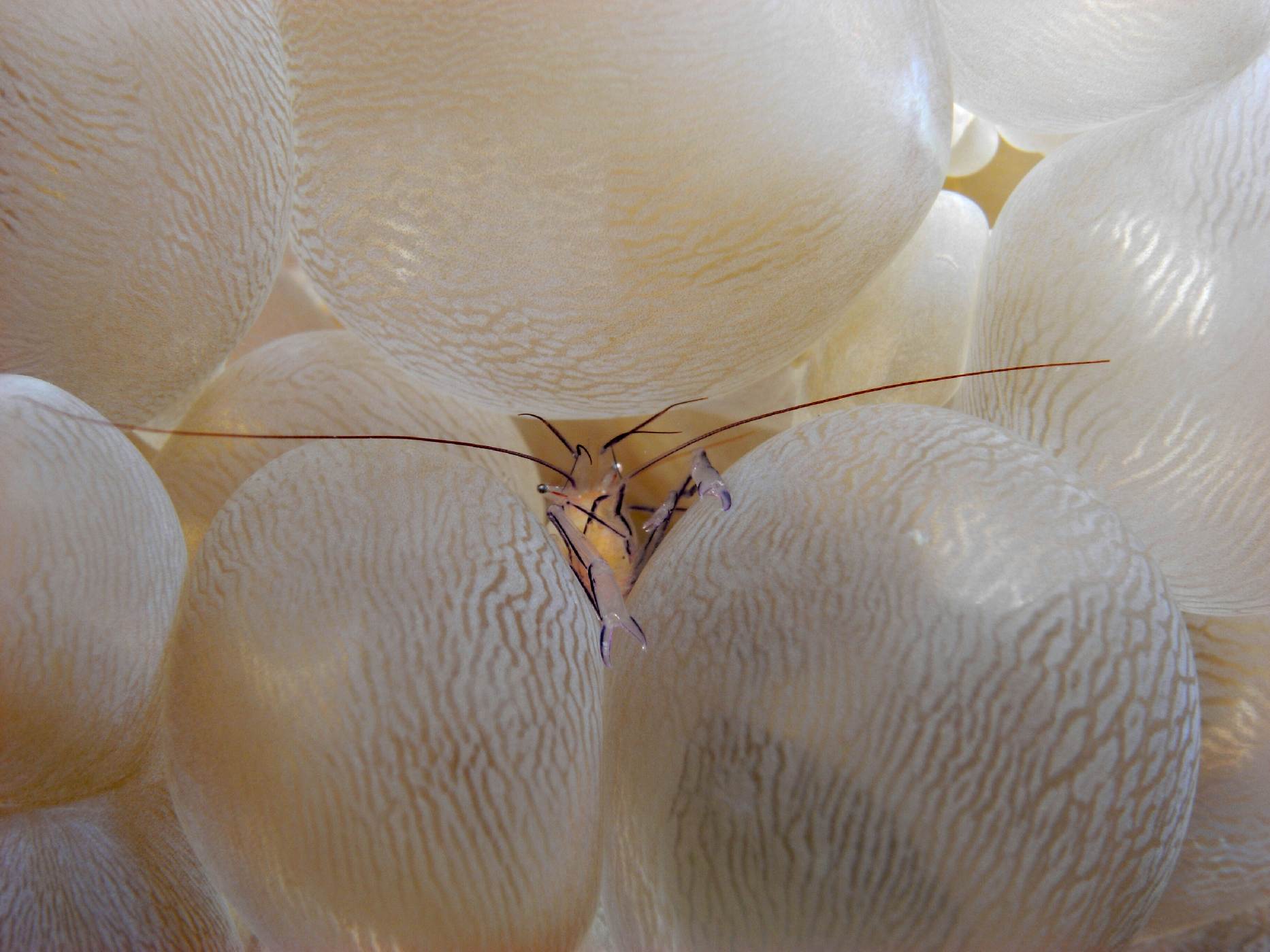 Kreveta Vir philipiensis ukrytá v bublinkovém korálu