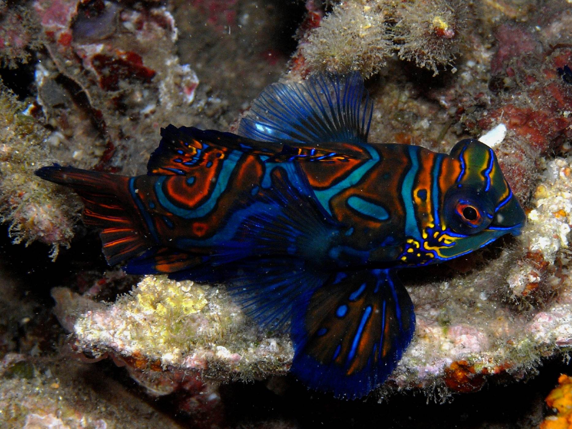 Nádherně zbarvené vřeténky mandarín Synchiropus splendidus jsou velké asi šest centimetrů. Obývají pole rozbitých korálů a velmi nerady se ukazují