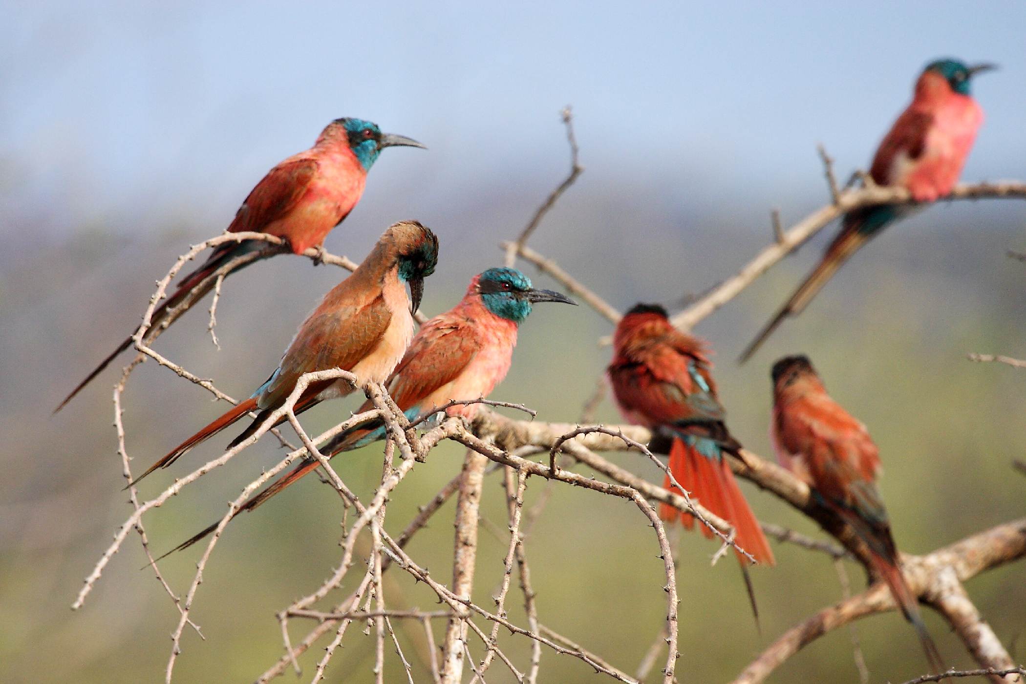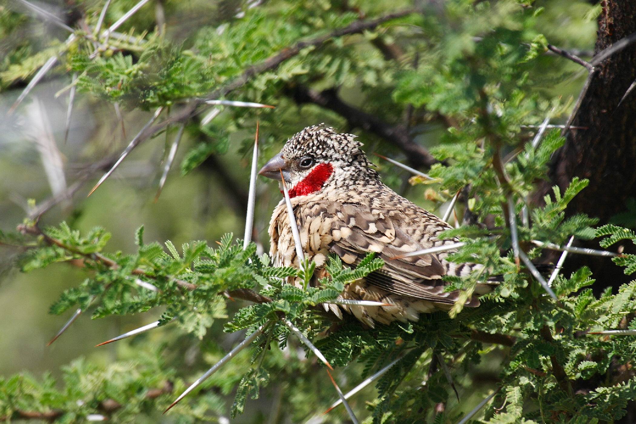 Amadina červenohlavá mezi trny akácie