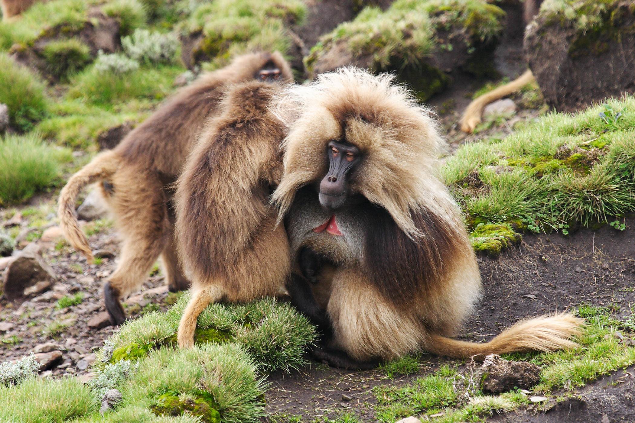 Endemické dželady hnědé (Theropithecus gelada) na svazích Semien Mountains
