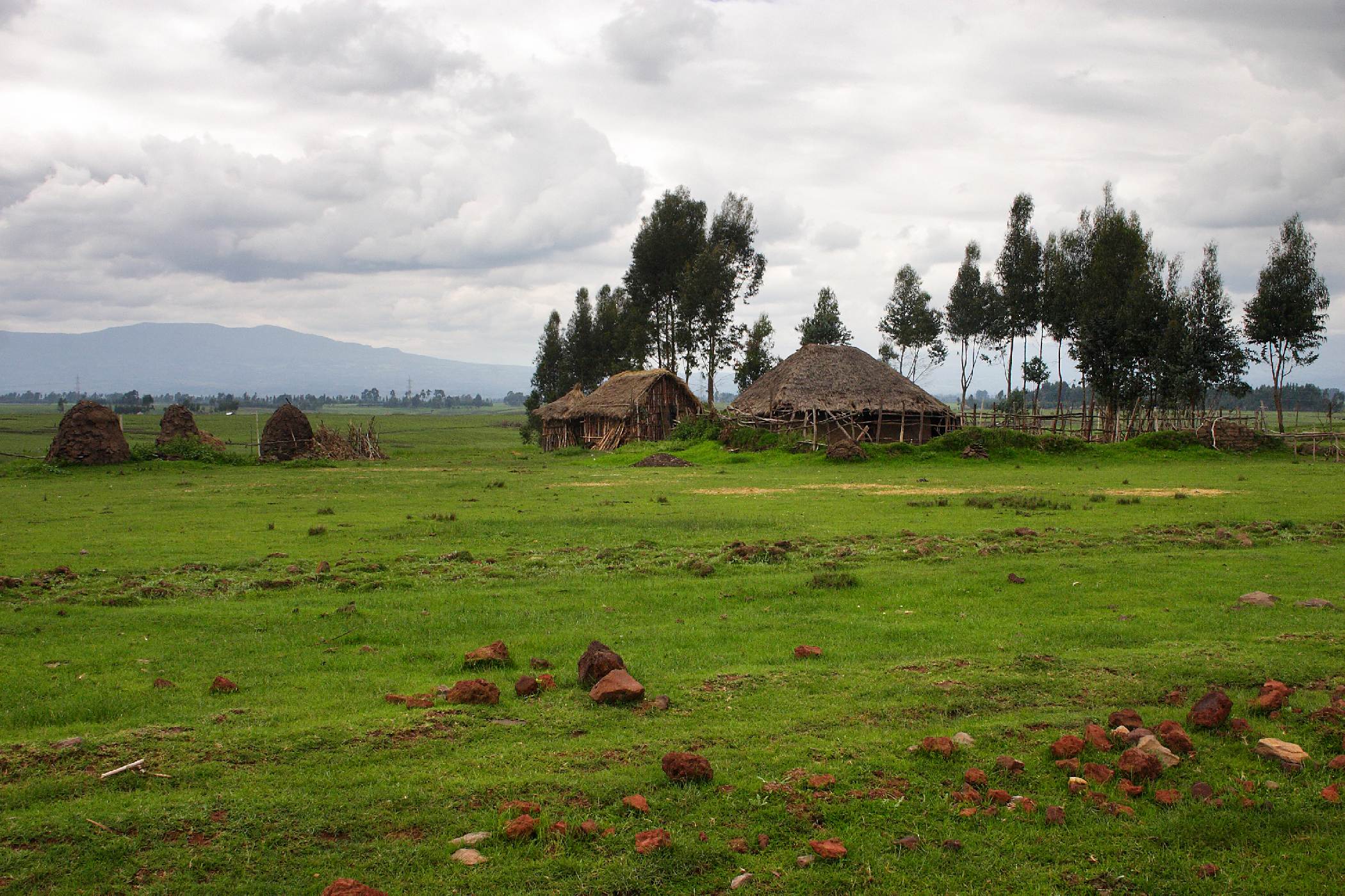 Etiopský venkov s chýšemi a vysázenými eukalypty
