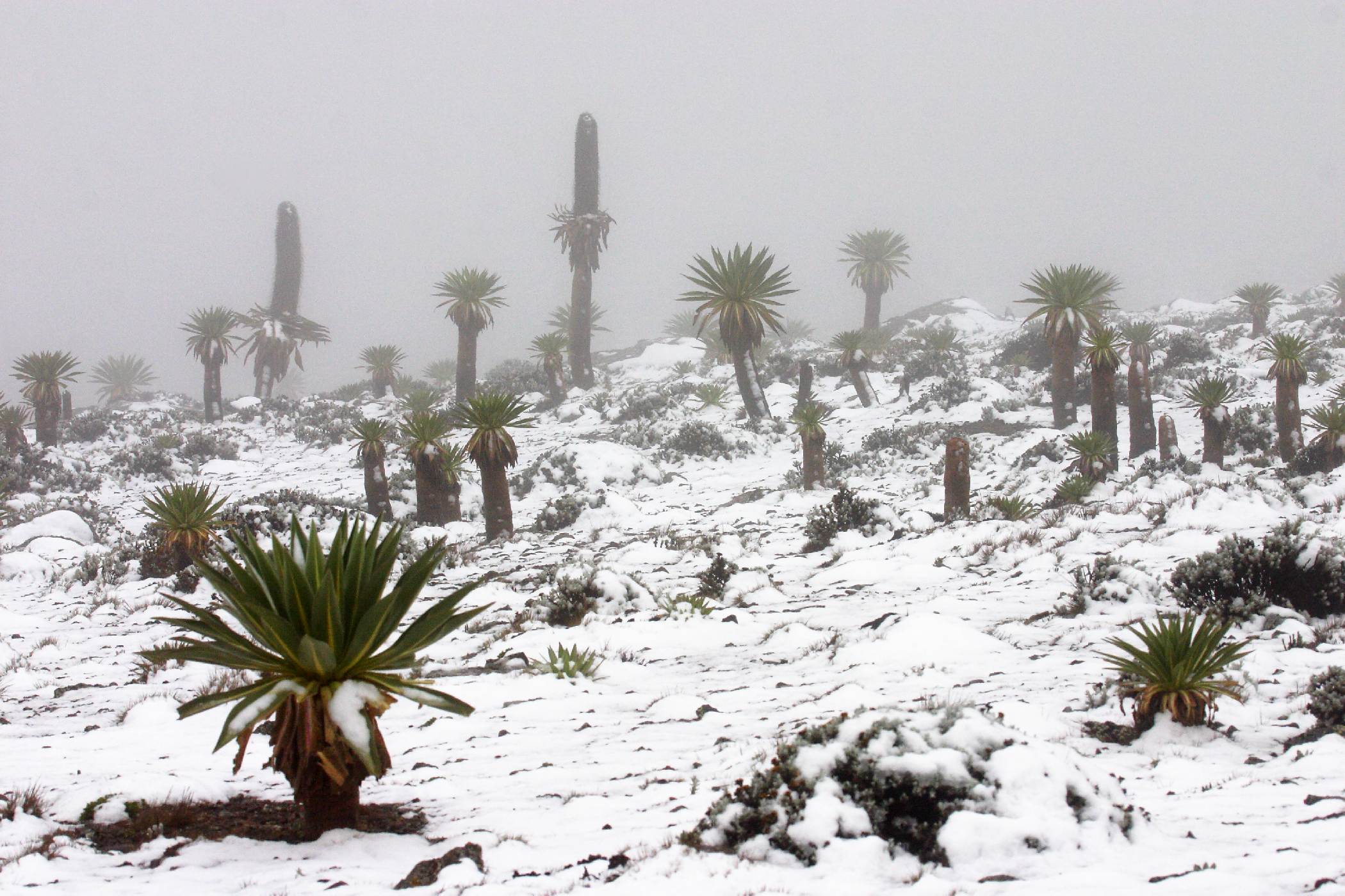 Sněhová nadílka v nejvyšších partiích Sanetti Plateau přikryla i obří lobélie