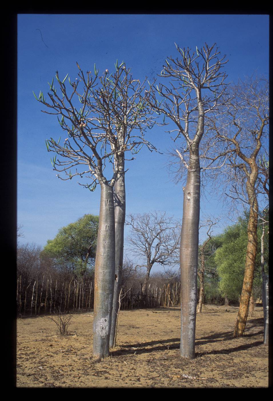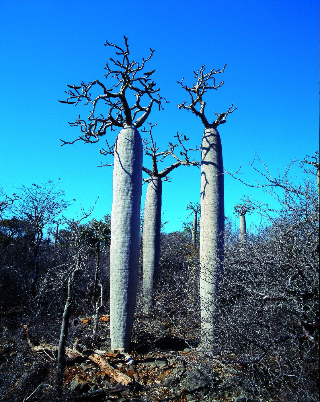 Šedé kmeny Pachypodium geayi musí být staré snad stovky let – v oblasti, kde prší jen pár dní v roce, roste vše neobyčejně pomalu
