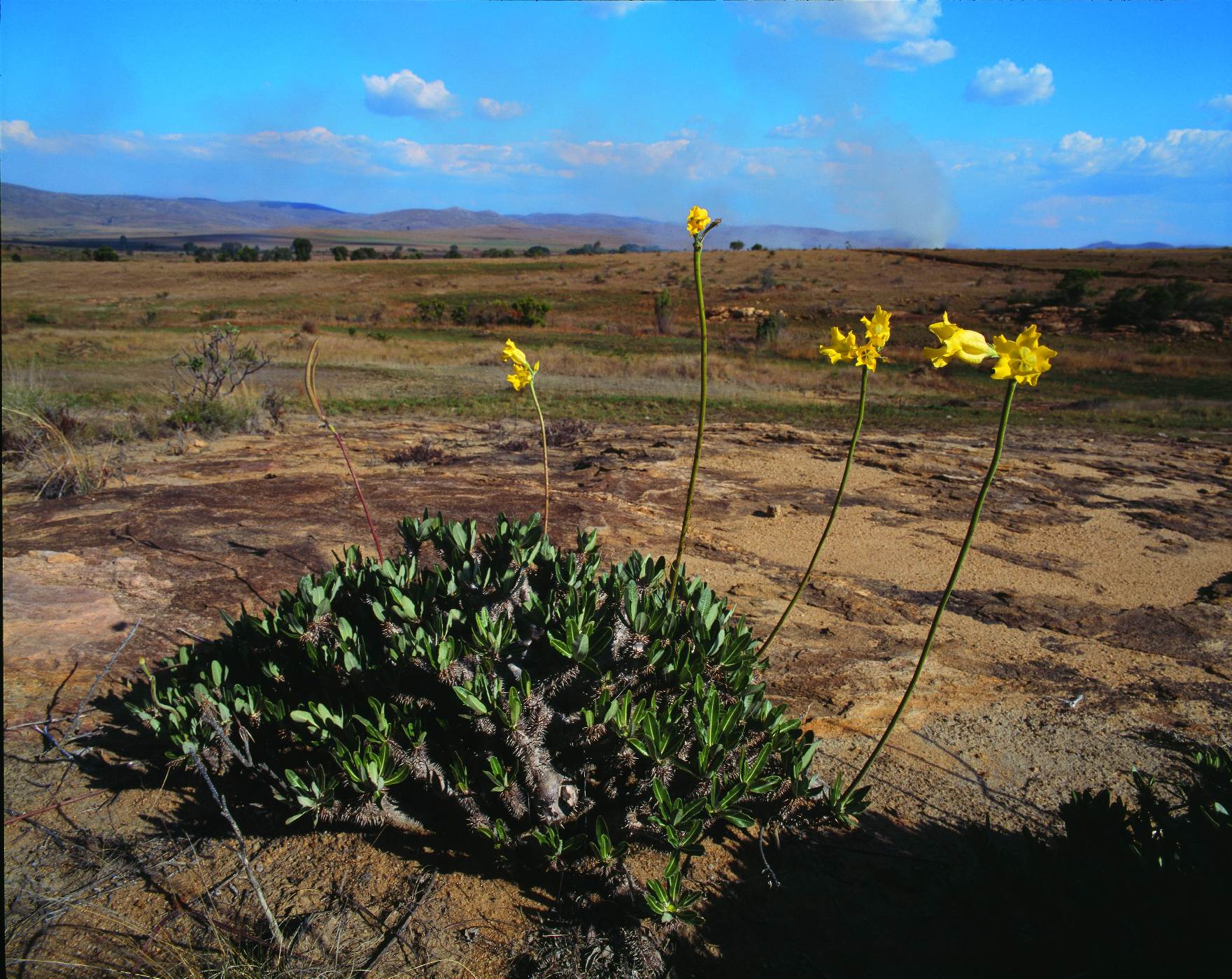Náhorní planina Horombe je nehostinným místem. Botanici však odsud nespěchají, a pokud se setkají s rozkvetlým keříkem Pachypodium horombense, jsou schopni strávit na rozžhavených skalkách celé dny