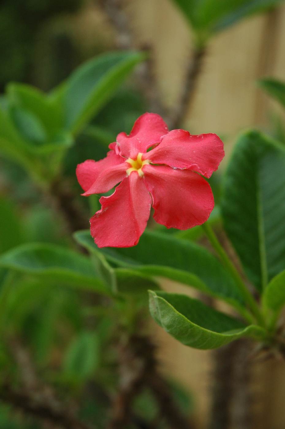Tmavě růžový květ Pachypodium baronii var. windsorii. Jméno variety dostalo podle naleziště, kterým je skála pojmenovaná Windsor Castle, tvarem připomínající hrad