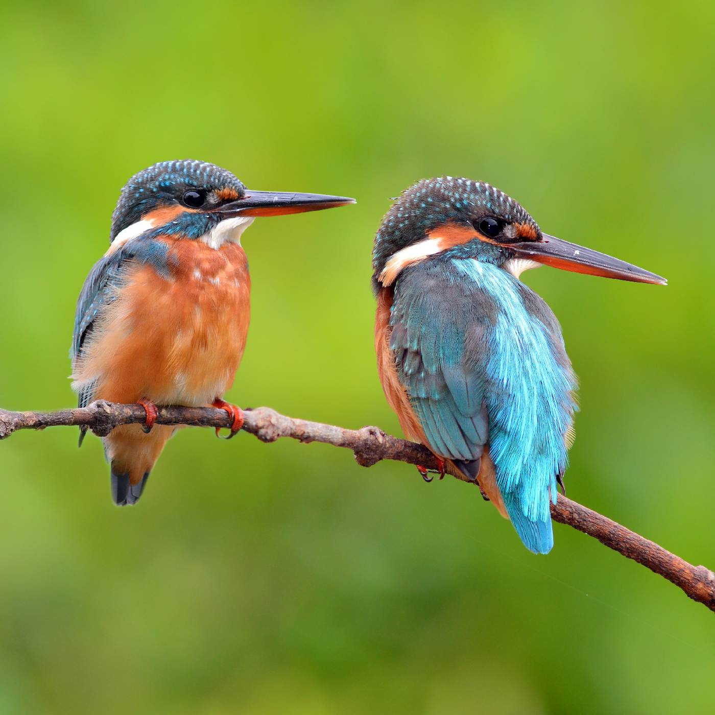 Dvojice ledňáčků říčních sedící na větvičce nad vodní hladinou. (foto: Shutterstock)