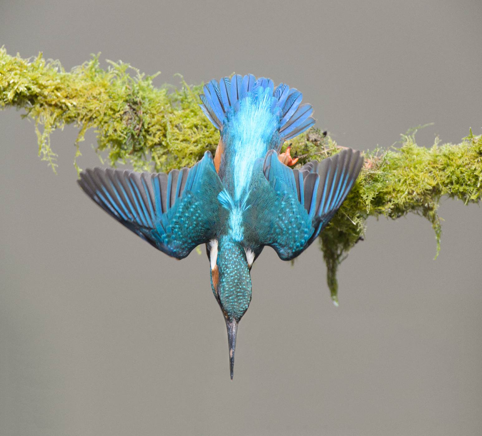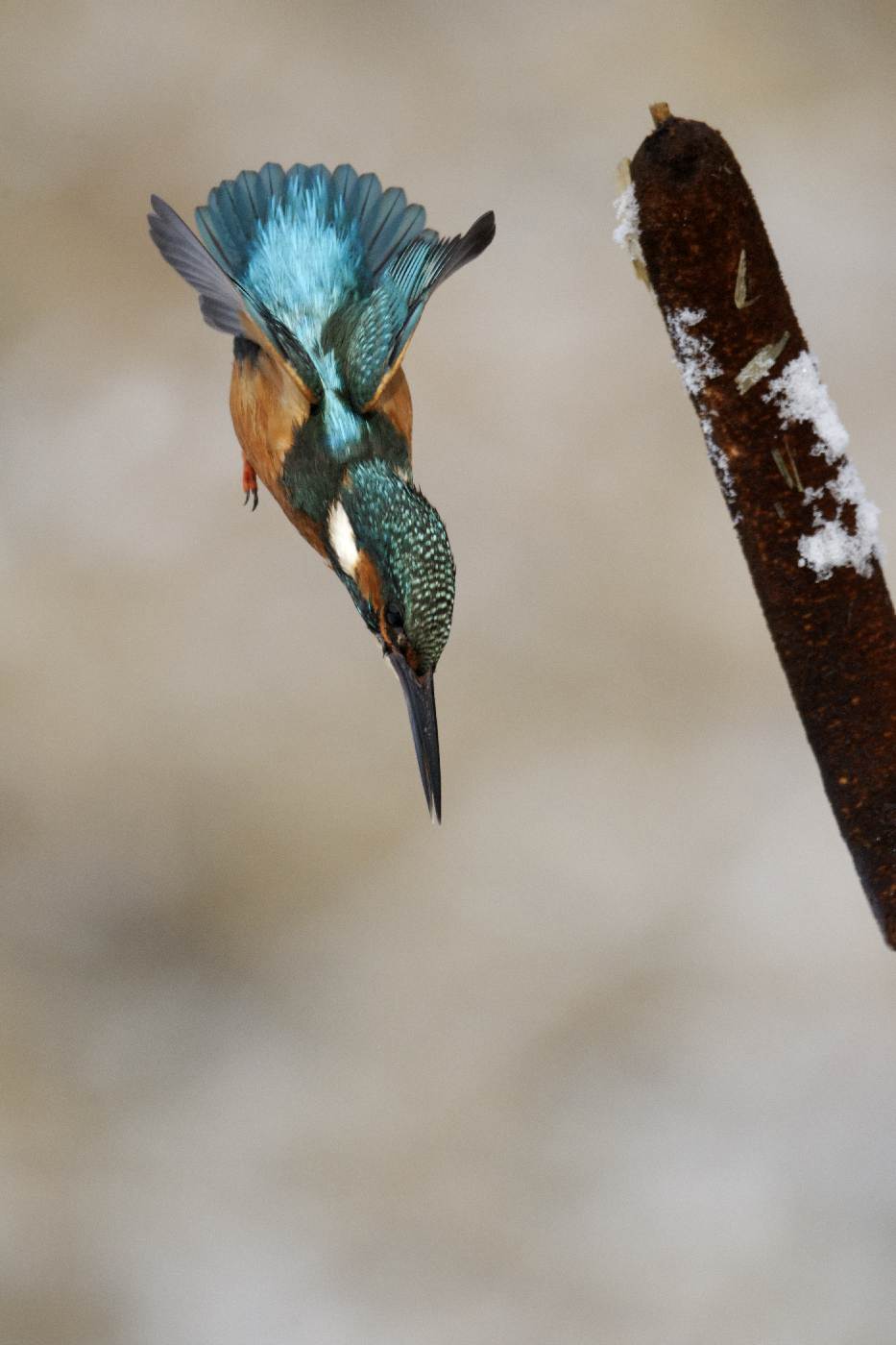 Ledňáček uviděl potenciální kořist a spouští se vertikálně z větve. (foto: Shutterstock)