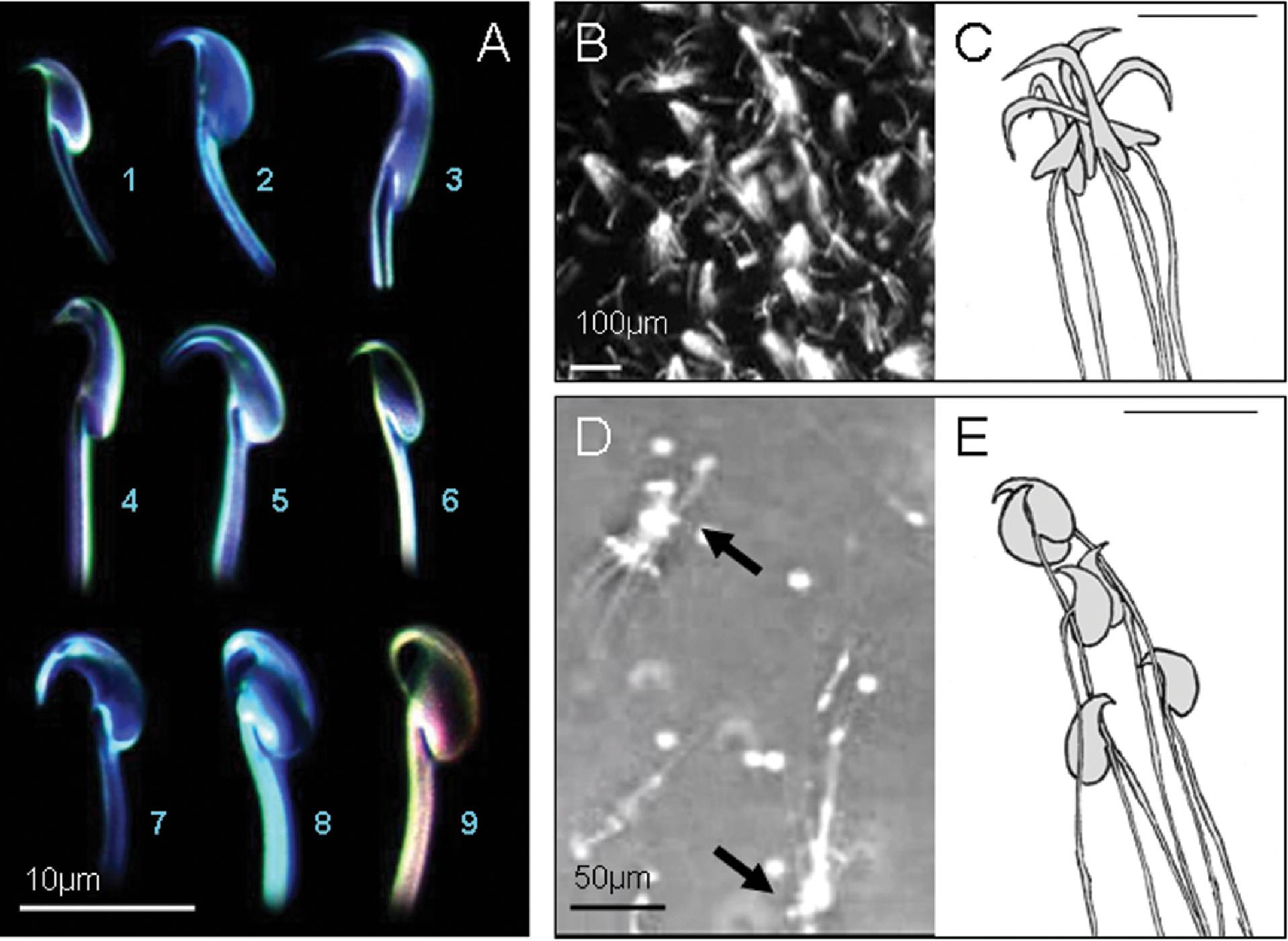 A) rozdílné tvary háčků u jednotlivých druhů hlodavců: 1) krysa Bunomys fratrorum, 2) myš domácí, 3) potkan, 4) krysa bažinná, 5) myška hastingská, 6) krysa ostnitá, 7) krysa Melomys burtoni, 8) myšice křovinná, 9) myšice východní