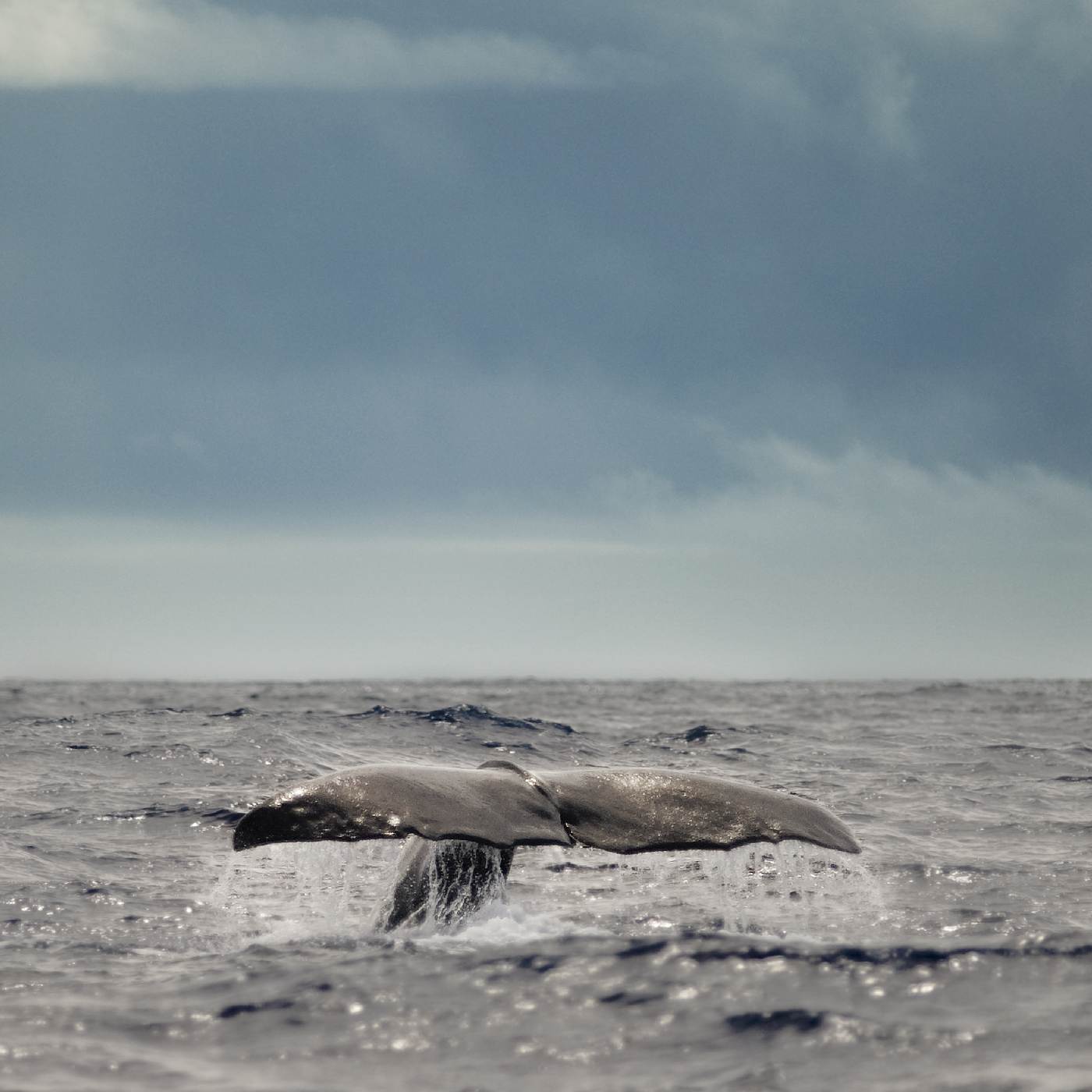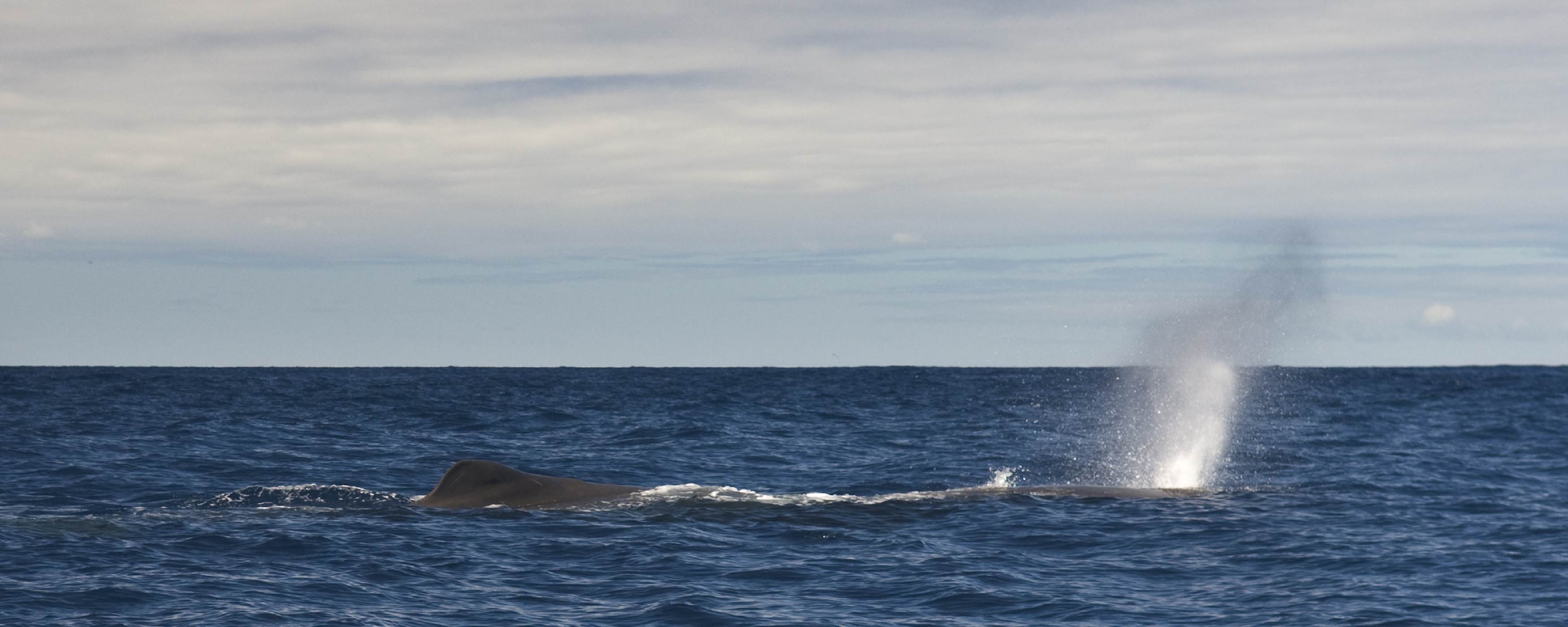 Osamělý samec vydechuje před ponorem do hlubin na hladině u Azorských ostrovů