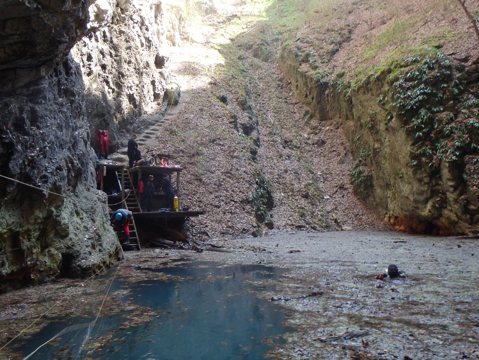 • Jezírko v Hranické propasti. Pohled k JV na vstupní svah a plošiny, kde se potápěči připravují na ponor (foto: Helena Vysoká)