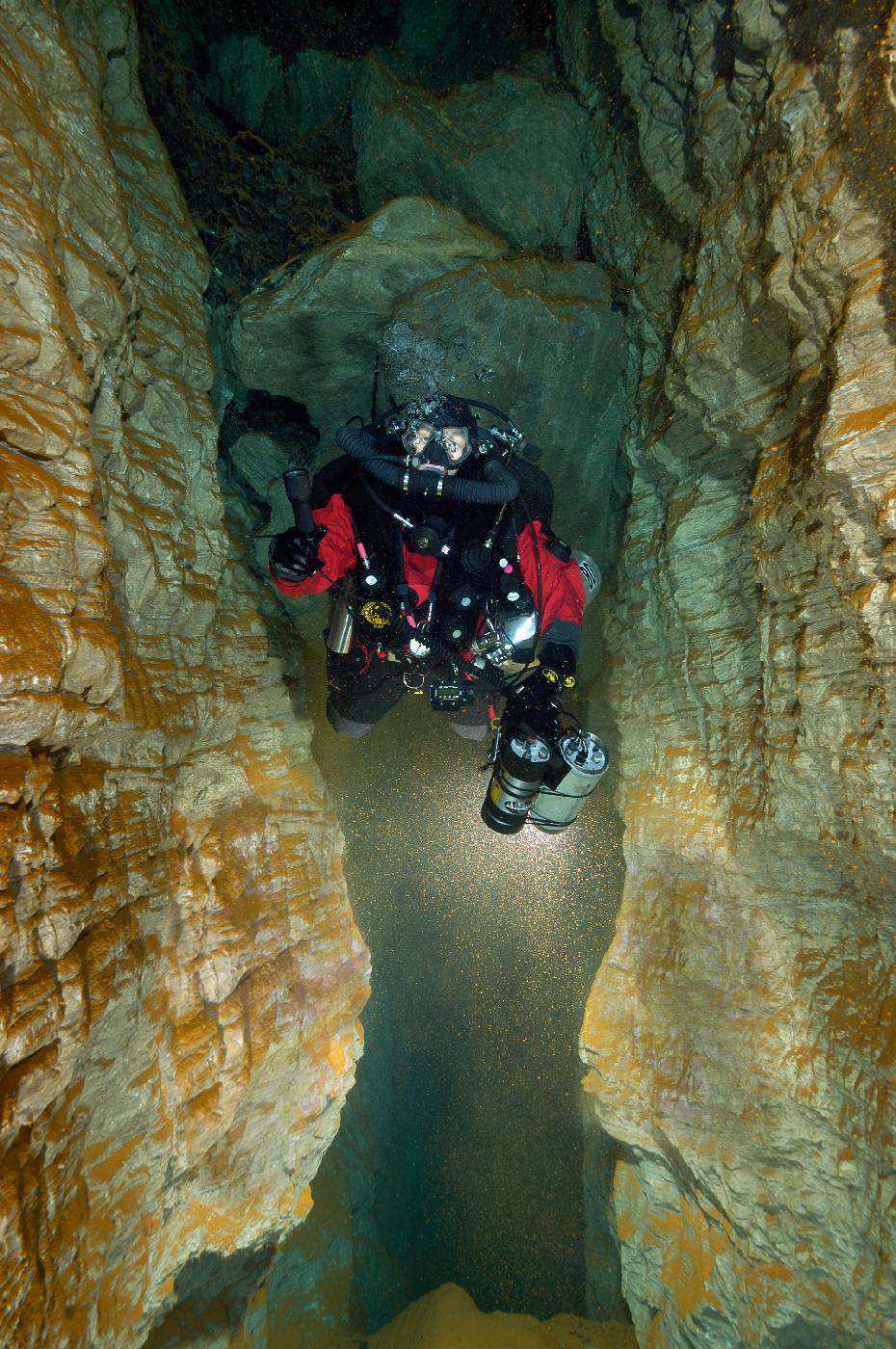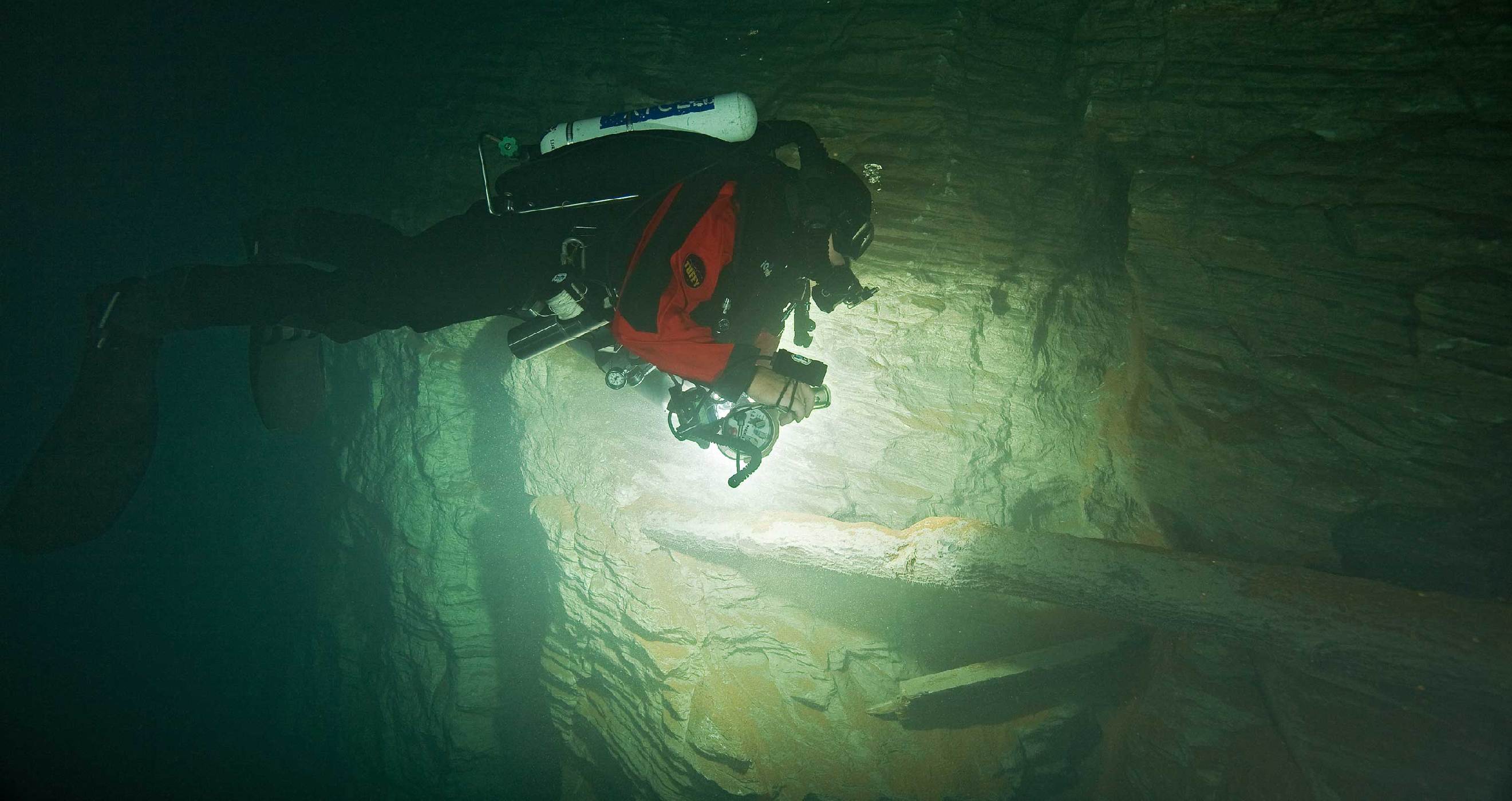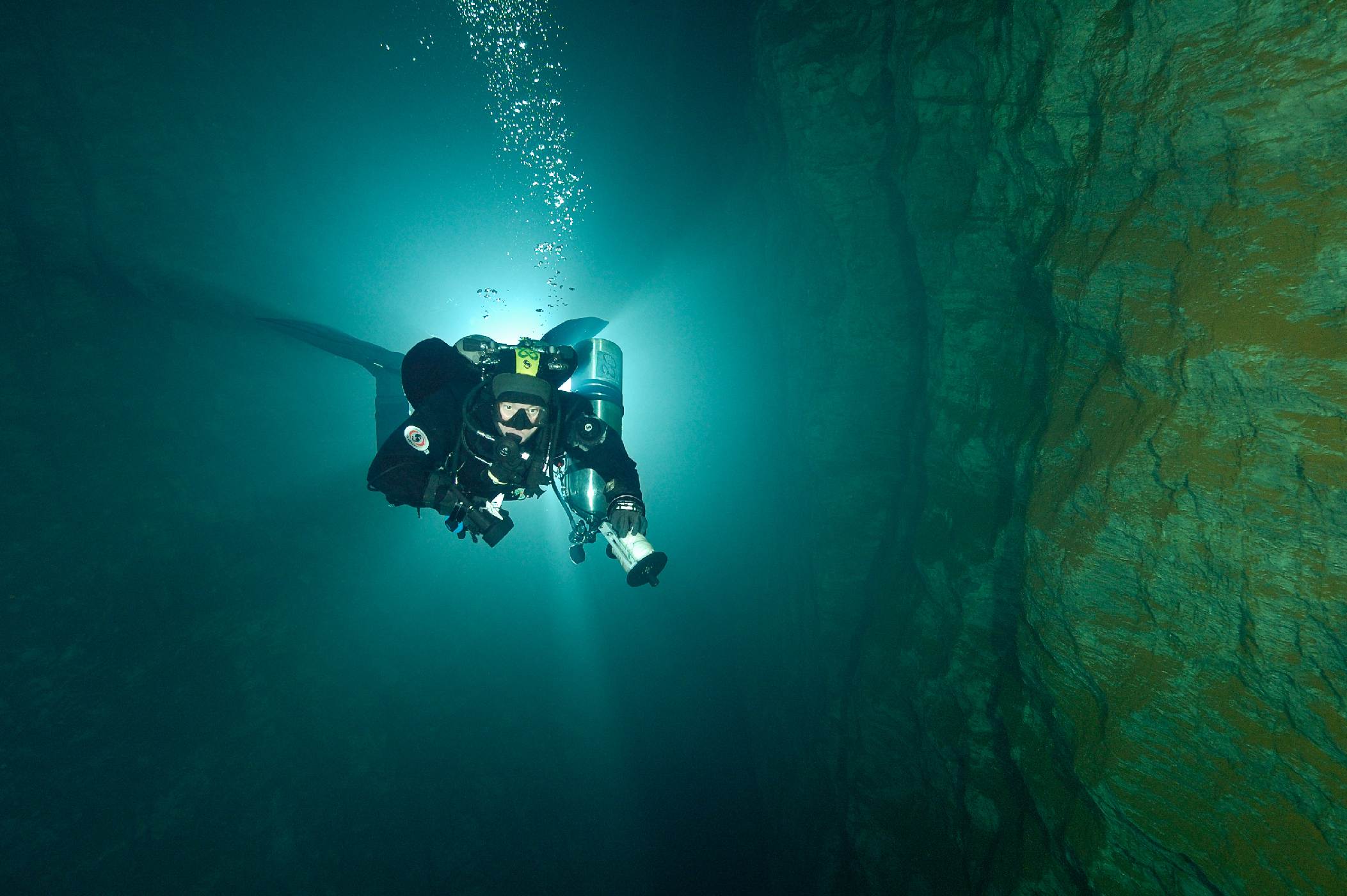 • Potápěč v Liftu (hloubka okolo 80 metrů) a kmen stromu zachycený na skalní stěně (foto: Petr Vaverka)