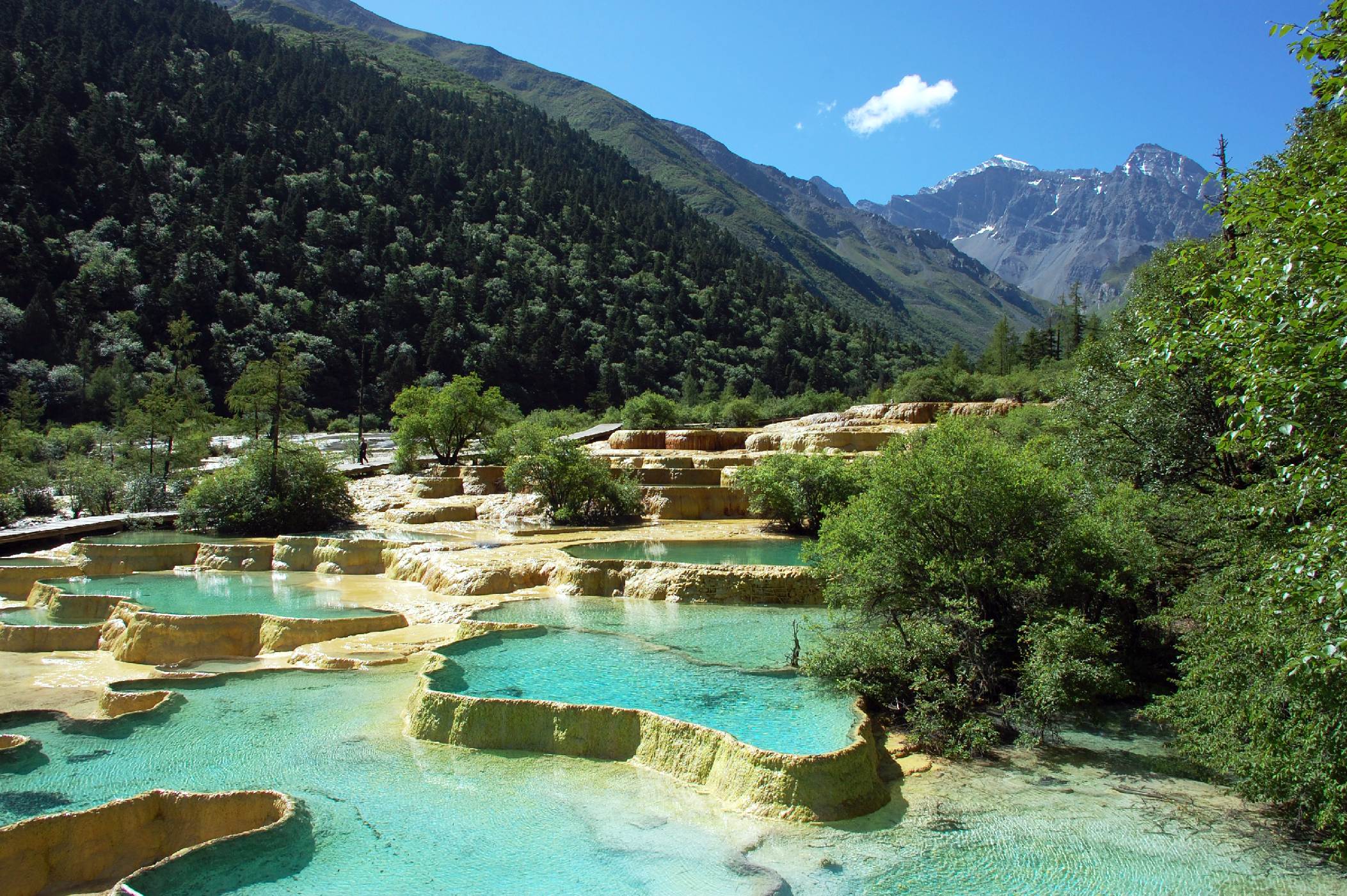 Blankytně modrá travertinová jezírka s pozadím horských vrcholků vytvářejí nezapomenutelný pohled