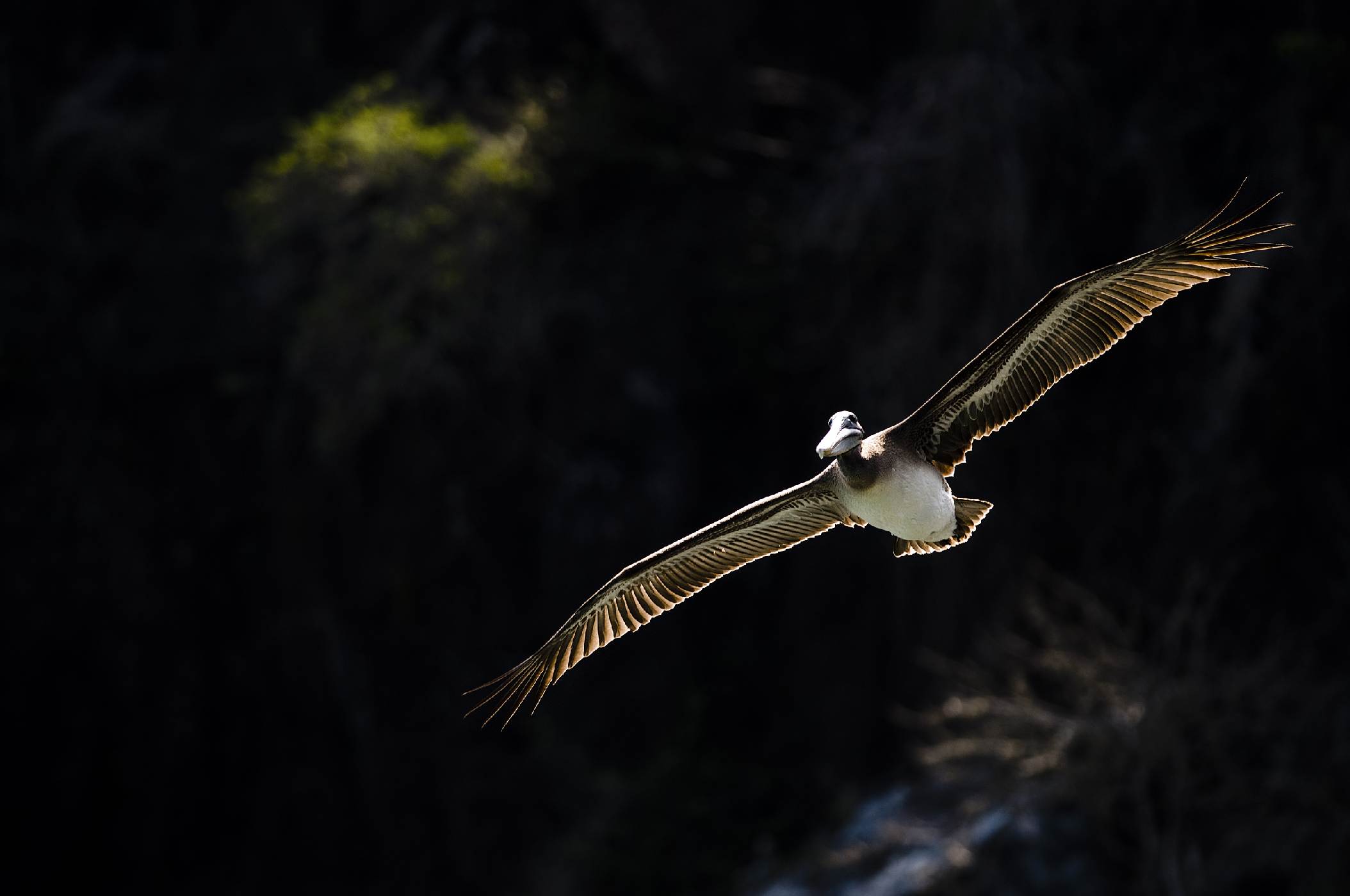 Pelikán hnědý v ranním rozbřesku na Galapážských ostrovech