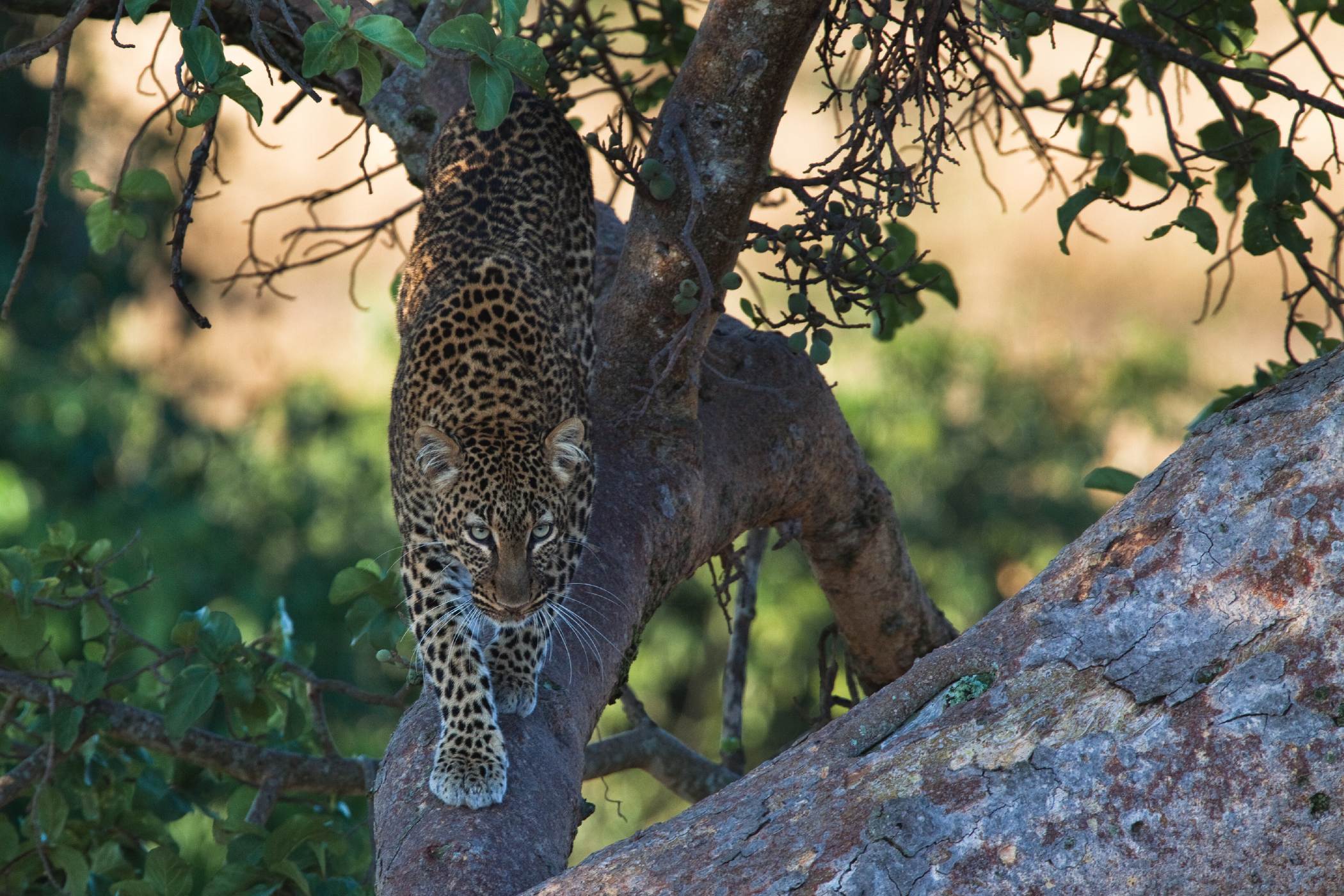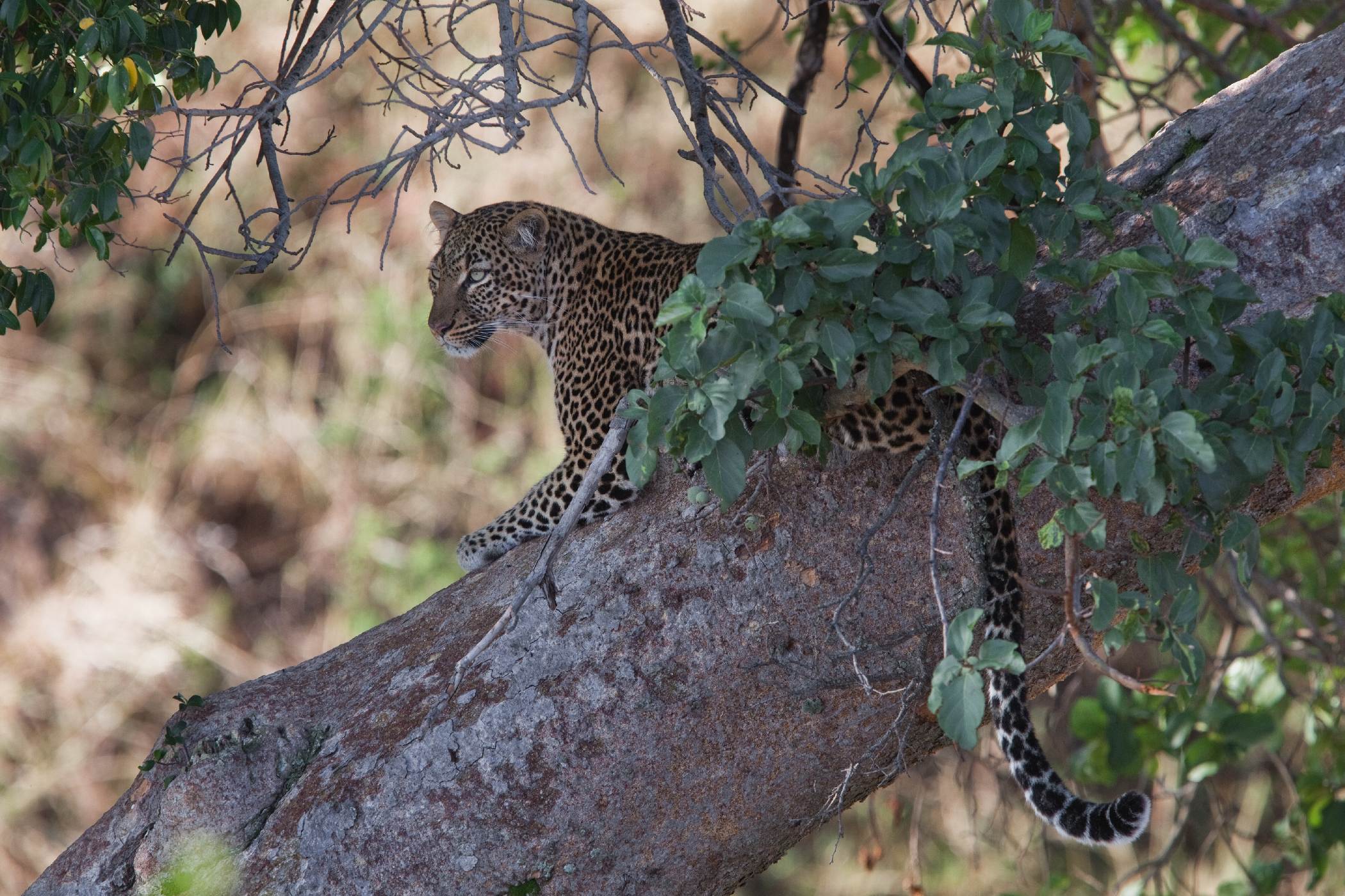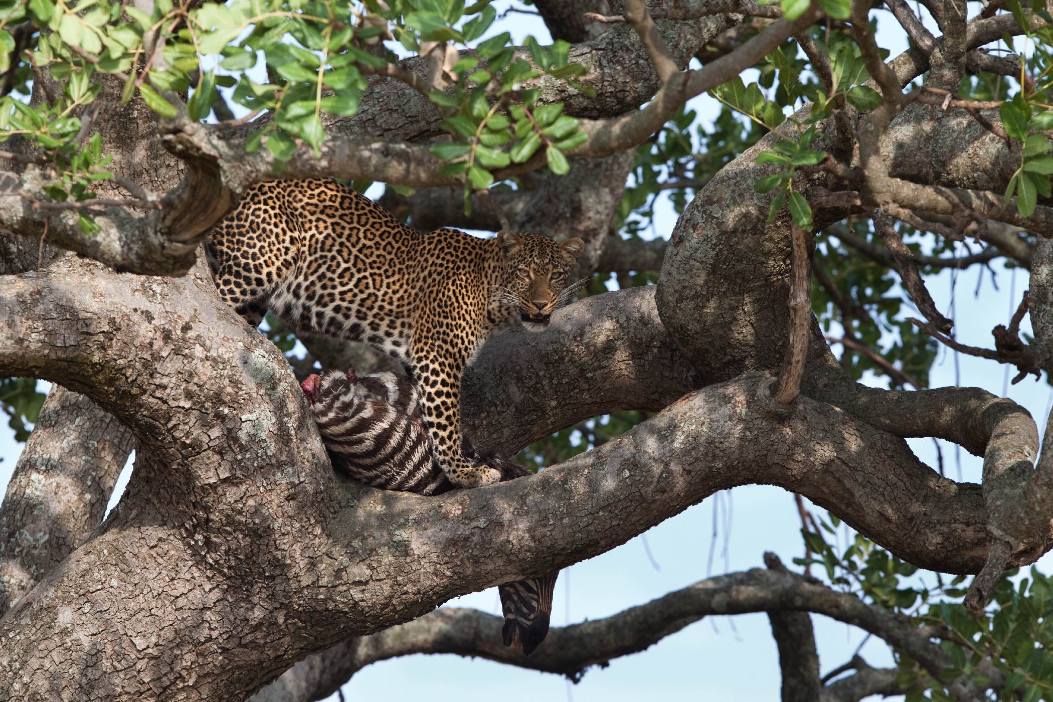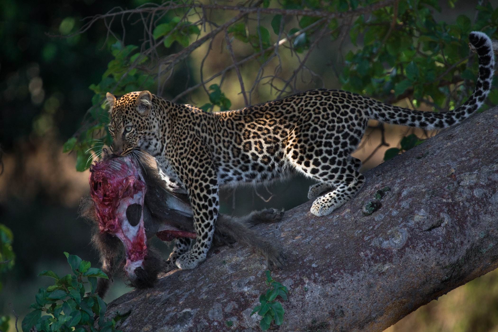 Masai Mara patří k místům, kde si levharti zcela běžně vytahují kořist na strom. Chrání si ji tak před jinými predátory