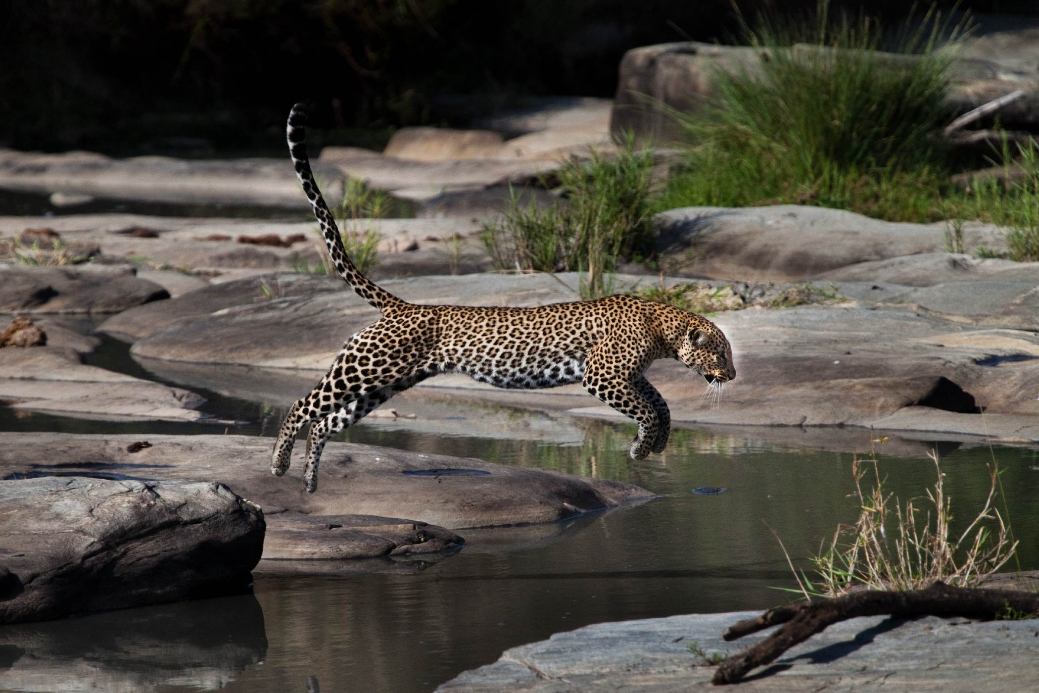 Krása těchto koček vynikne hlavně při pohybu. Na fotografii je levhart, který má teritorium v okolí řeky Talek