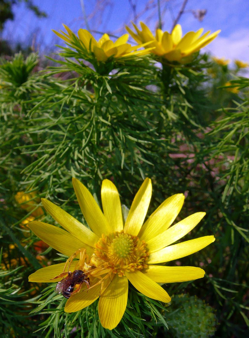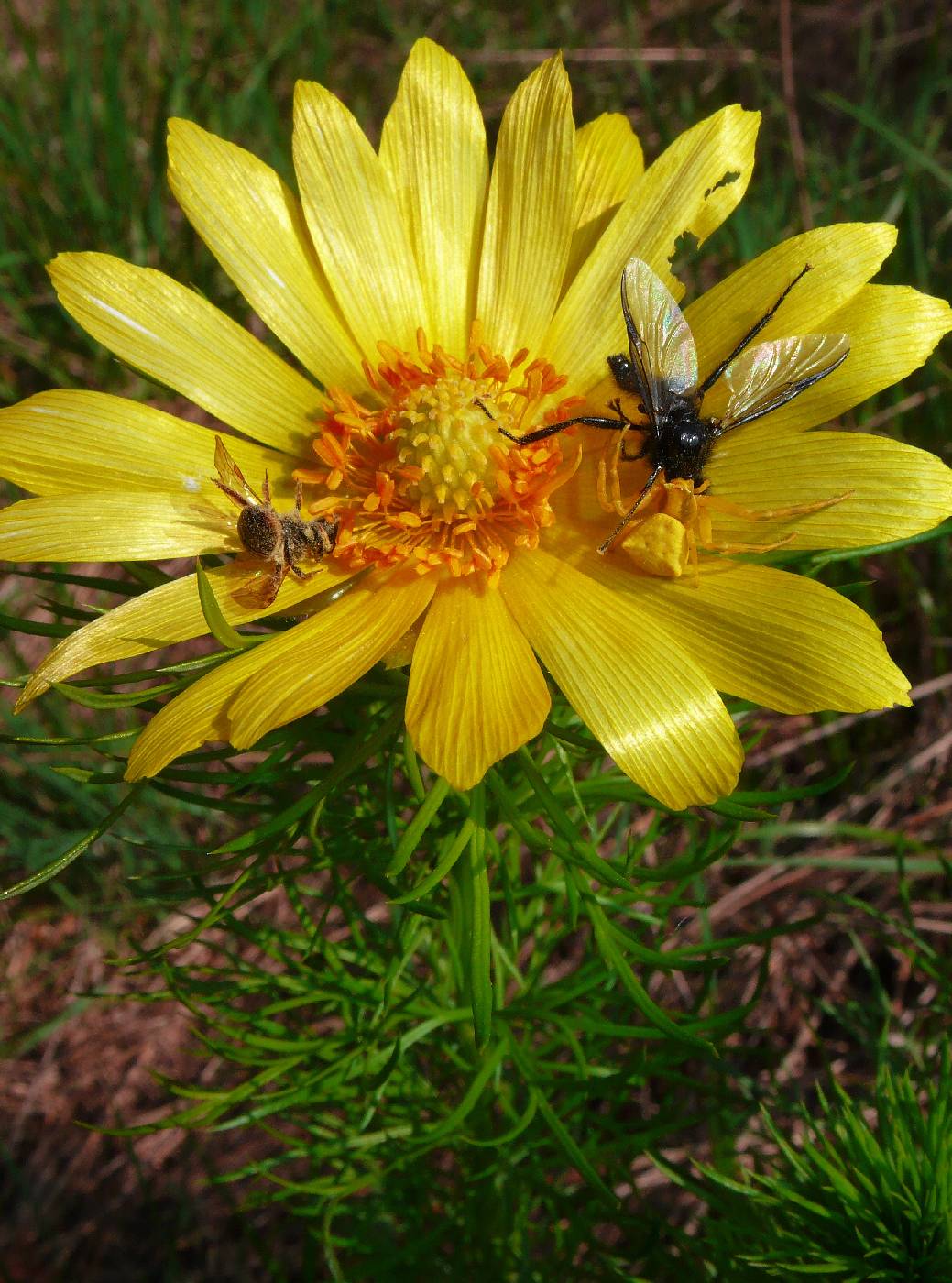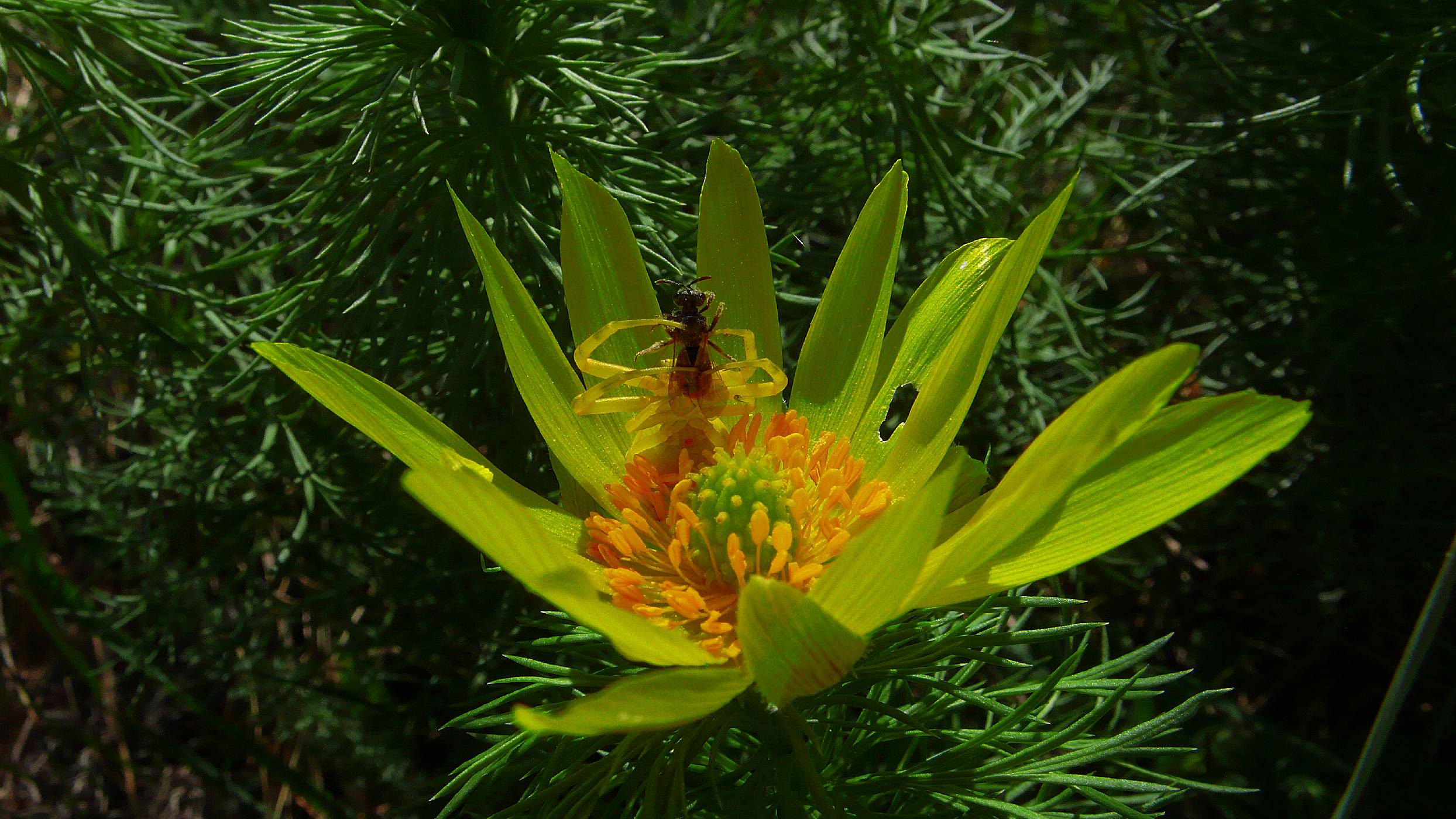 Dokonale symetrický květ hlaváčku jarního (Adonis vernalis). Takovou dokonalost ovšem pavouci nevyhledávají, protože jsou na květu snadno k odhalení