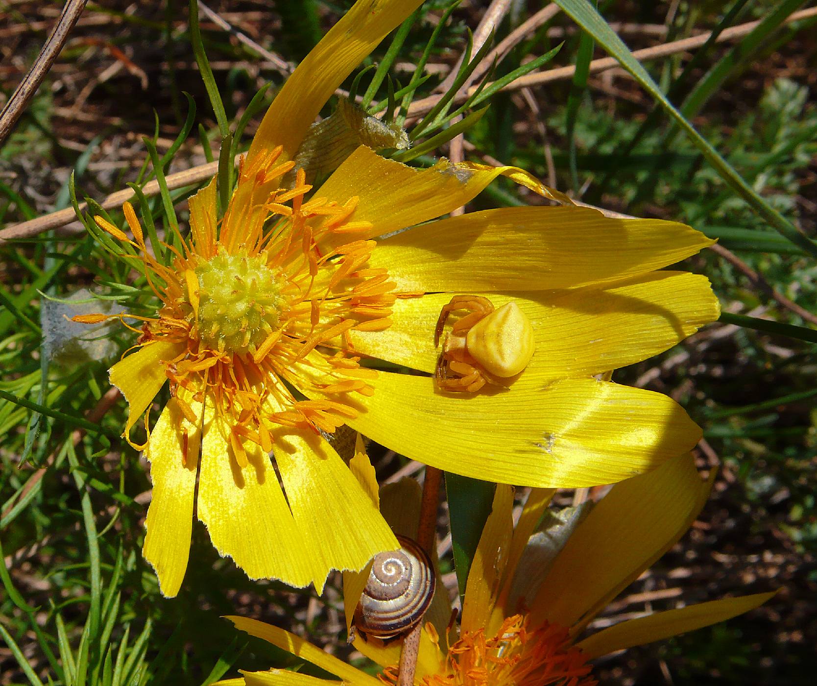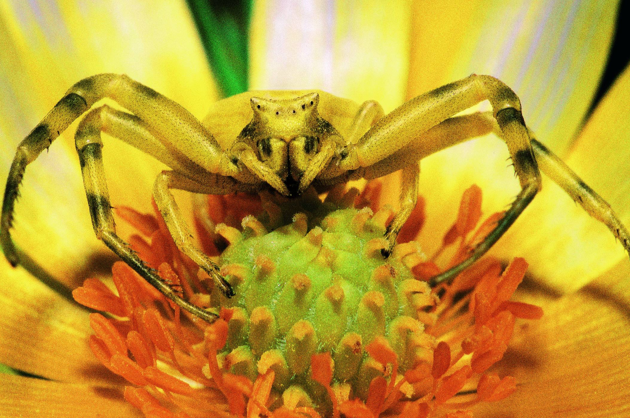 Běžník květomilný (Thomisus onustus) napodobuje měkkýši napadené a napůl rozežrané květy