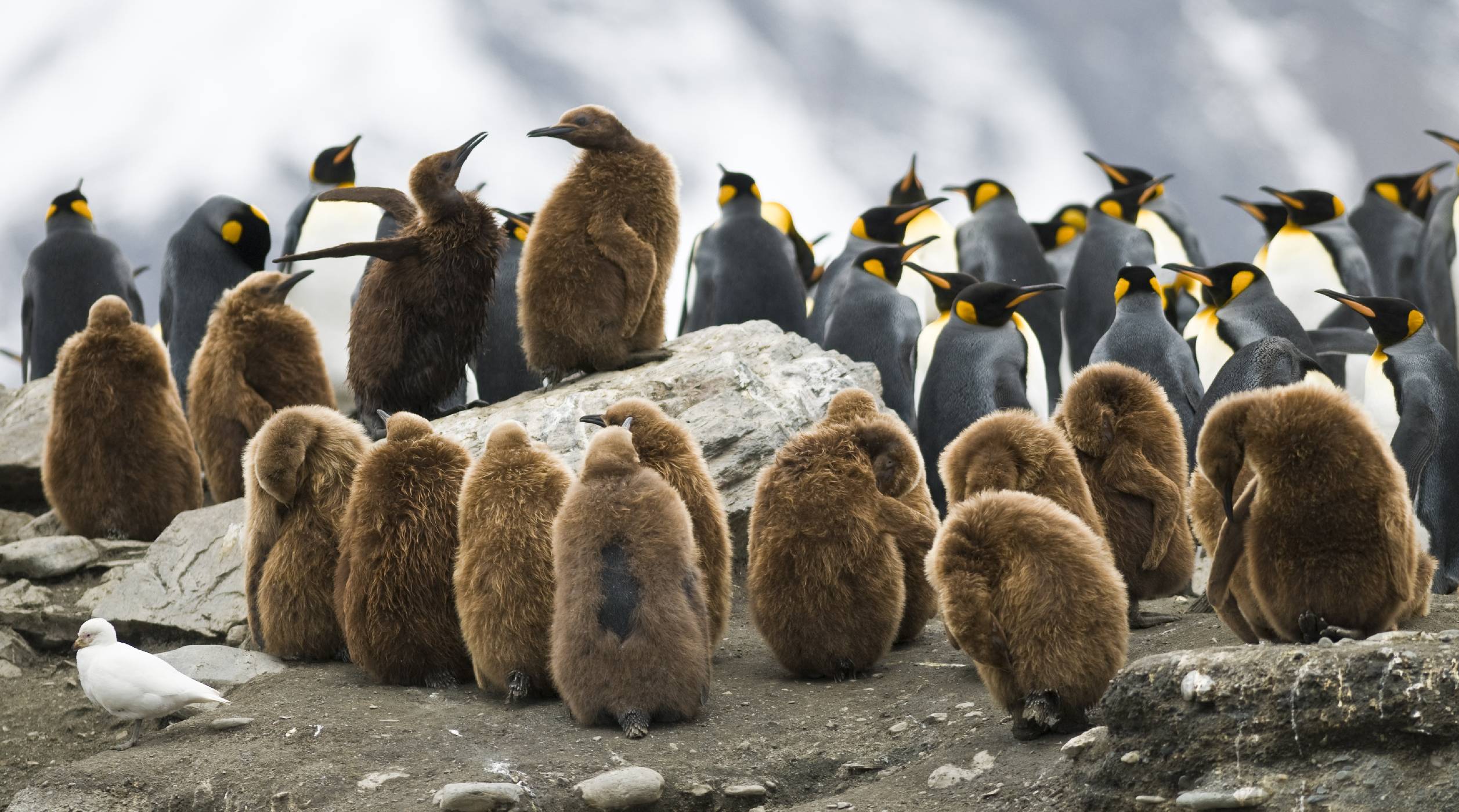 Tučňáci patagonští a jejich dosud nevybarvená mláďata, která po 3–4 měsících intenzivního krmení dosáhnou váhy 10–12 kilogramů.