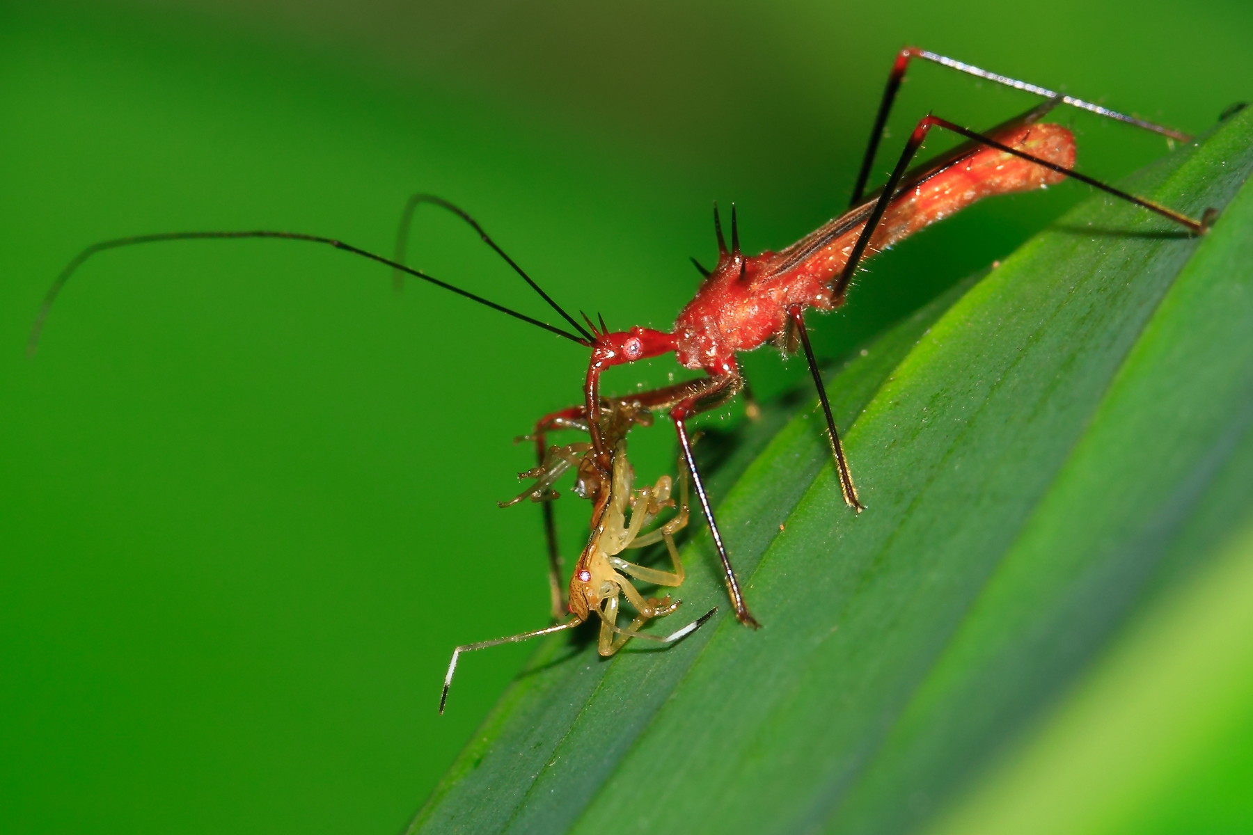 Ploštice z čeledi zákeřnicovitých se svou pavoučí kořistí.