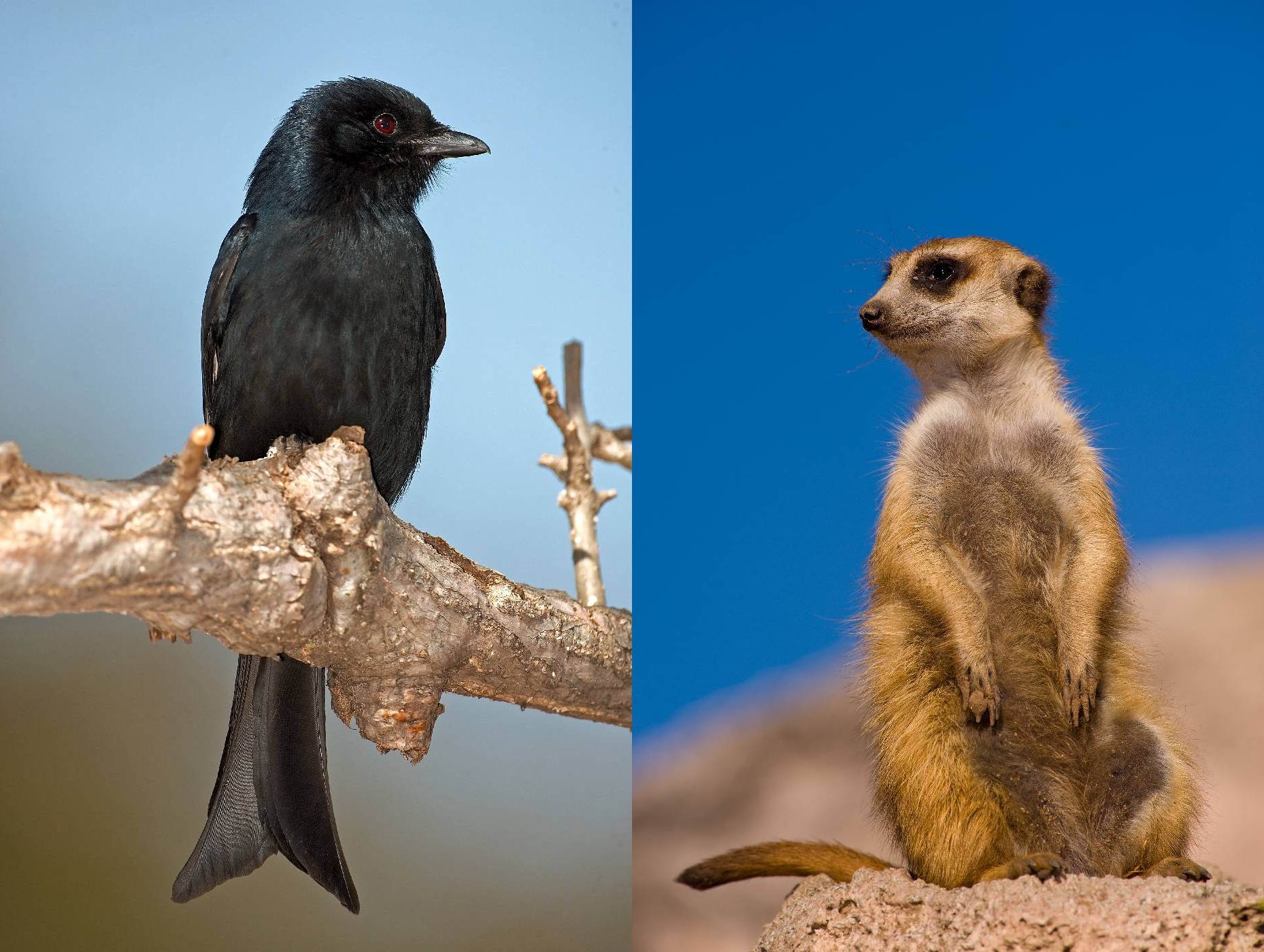 Drongo vydá signál o blížícím se predátorovi a když surikaty zmizí v noře, pustí se do jejich kořisti
