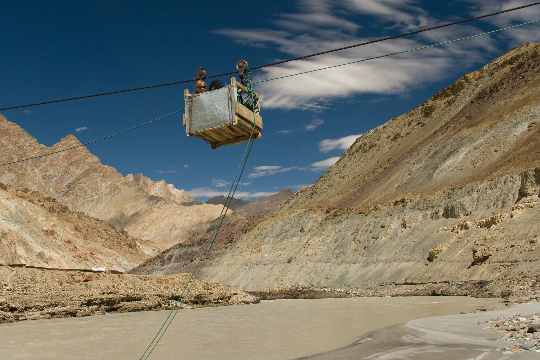 Lanovka přes řeku Zanskar u osady Chiling je lehce dobrodružným začátkem treku do sedla Ganda La