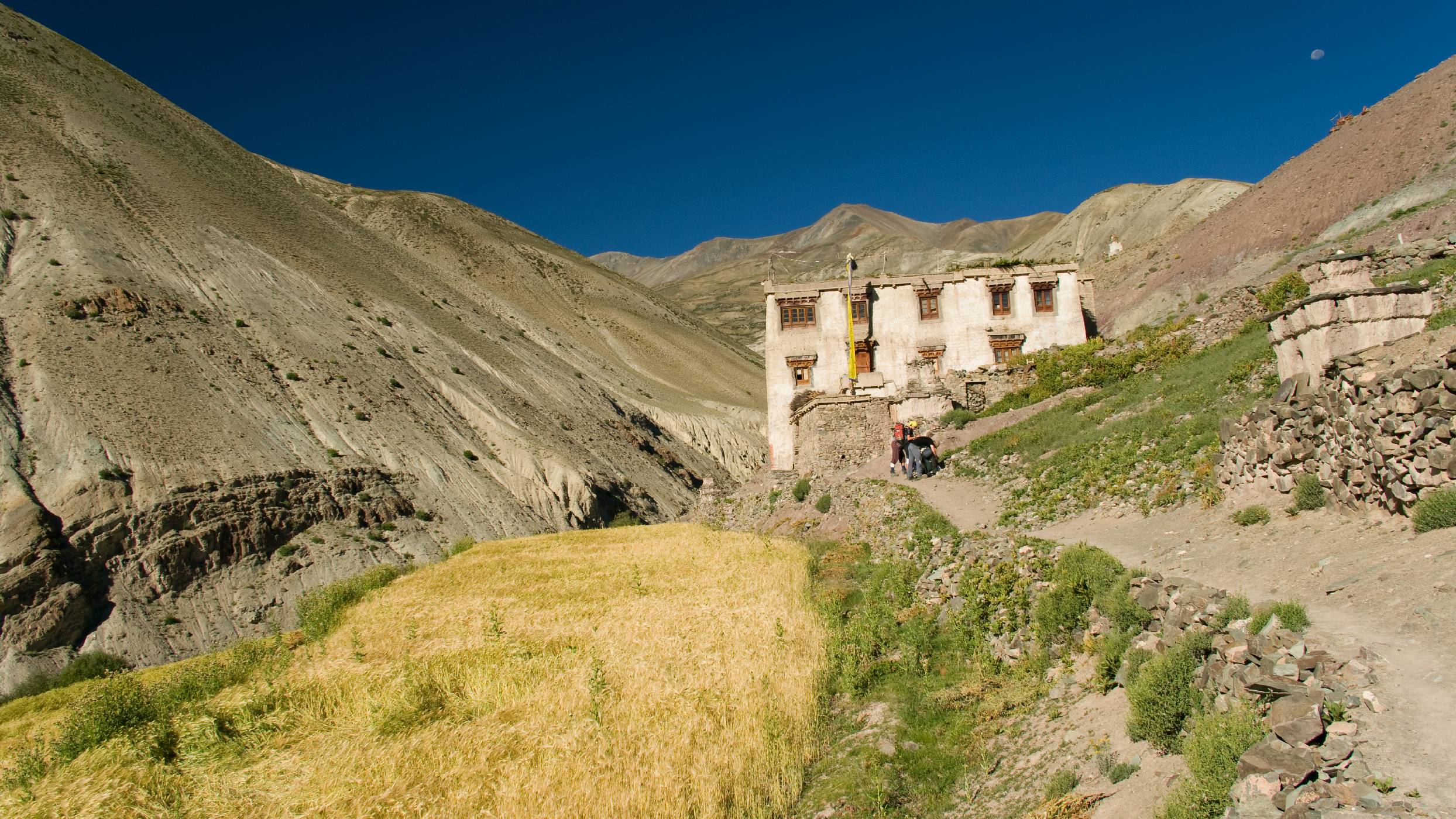 Obilná políčka šplhají na svazích vysoko nad 4 000 m n. m., obklopena skromnými příbytky