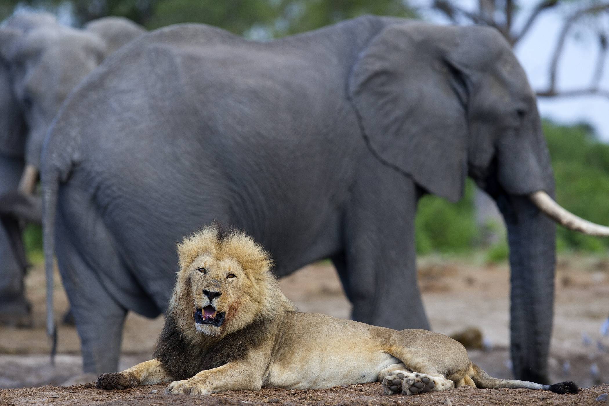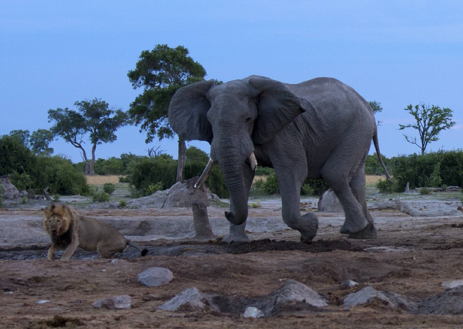 Fotka pořízená za špatných světelných podmínek, ale zvířata si nevybírají dobu ani místo. Sloní samec ukazuje lvovi, kdo je vládcem u napajedla. Vzájemné chování zvířat, tedy nejen lvů a slonů, se v období sucha znatelně mění
