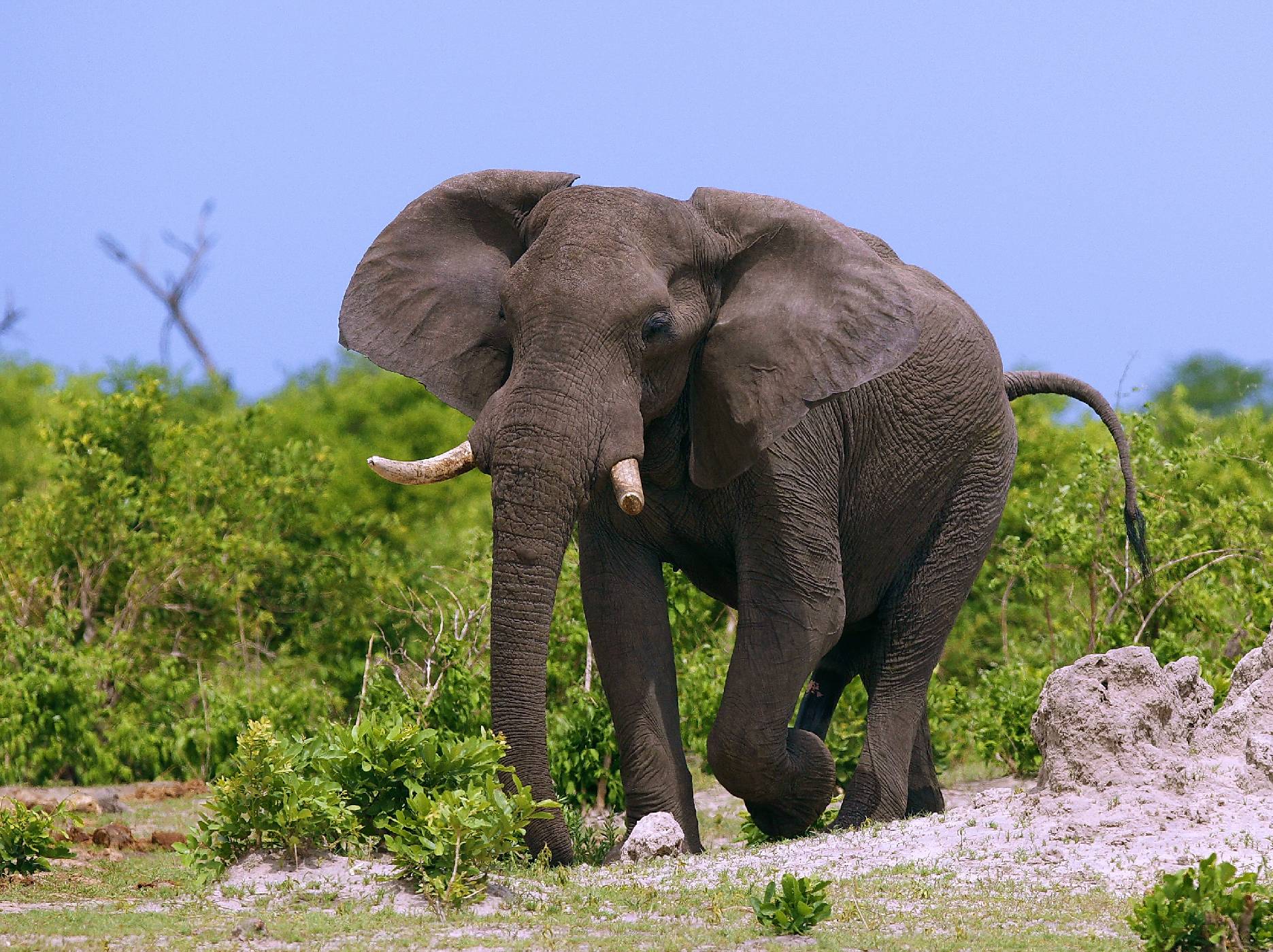 Vzrušený sloní samec přichází k napajedlu. Roztahováním uší a celkovým vzezřením dává lvům najevo, že se přišel napít