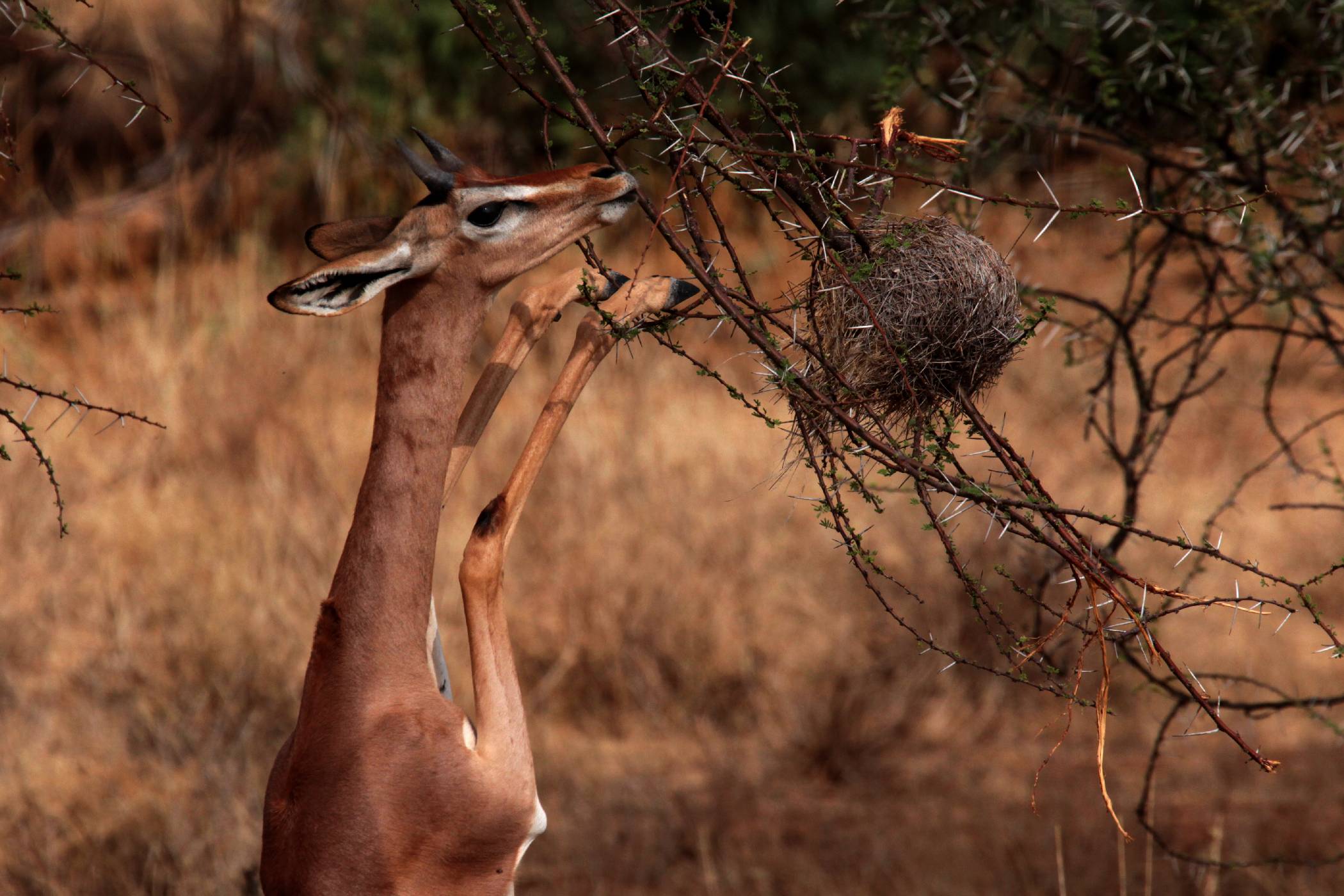 Gerenuk neboli antilopa žirafí se dokáže postavit na zadní, aby mohl ožírat mezi trny lístky akácií