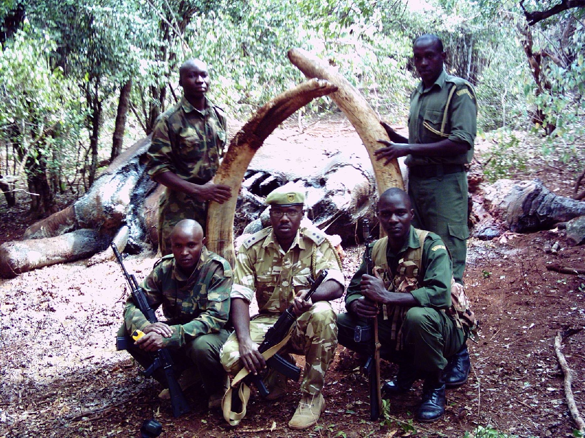 • Patrola pod vedením Jacka Marabua se zabavenými kly u slona, kterého zabili pytláci. Z archivu KWS