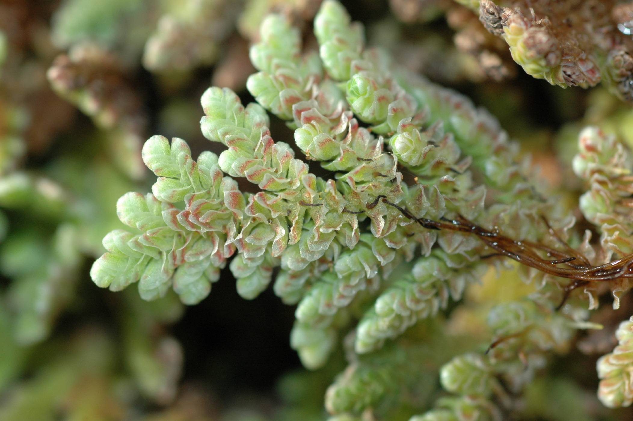 Pohled na spodní stranu azoly Azolla filiculoides odhaluje listy, kterými dochází k příjmu živin, i kořeny, jenž mají stejným úkol