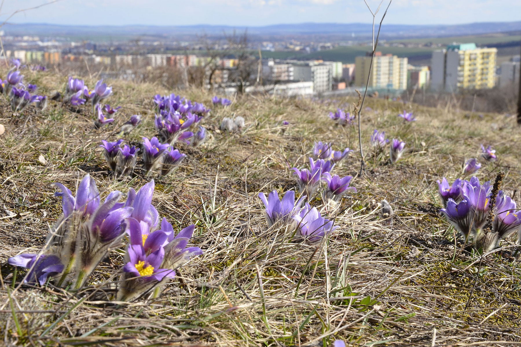 Pohled na louku Kamenného vrchu směrem na Brno s rozkvetlými konikleci velkokvětými (Pulsatilla grandis) v přírodní rezervaci Kamenný vrch v Brně. (foto: Wikimedia Commons, Linvivo, CC BY-SA 3.0)