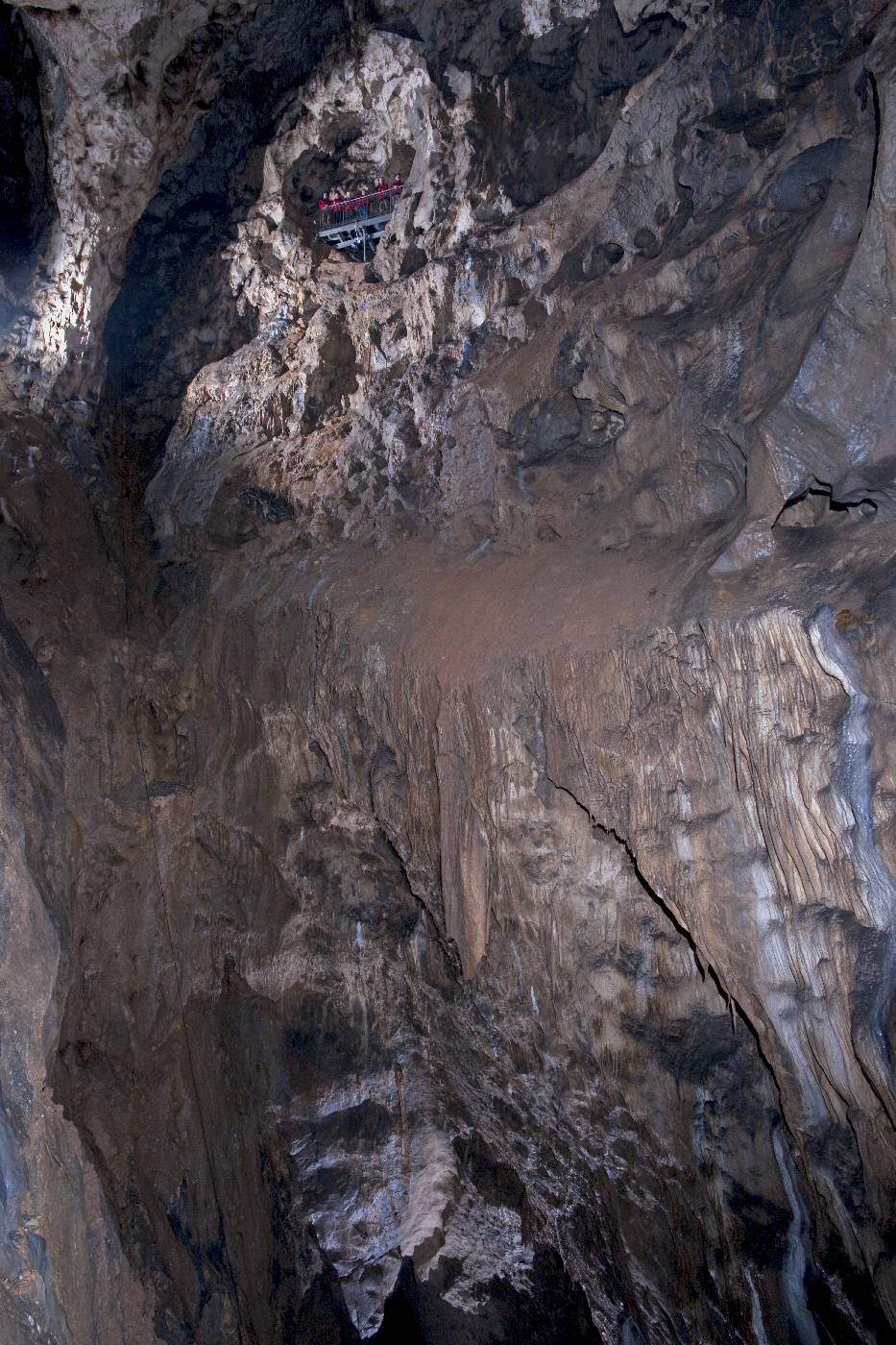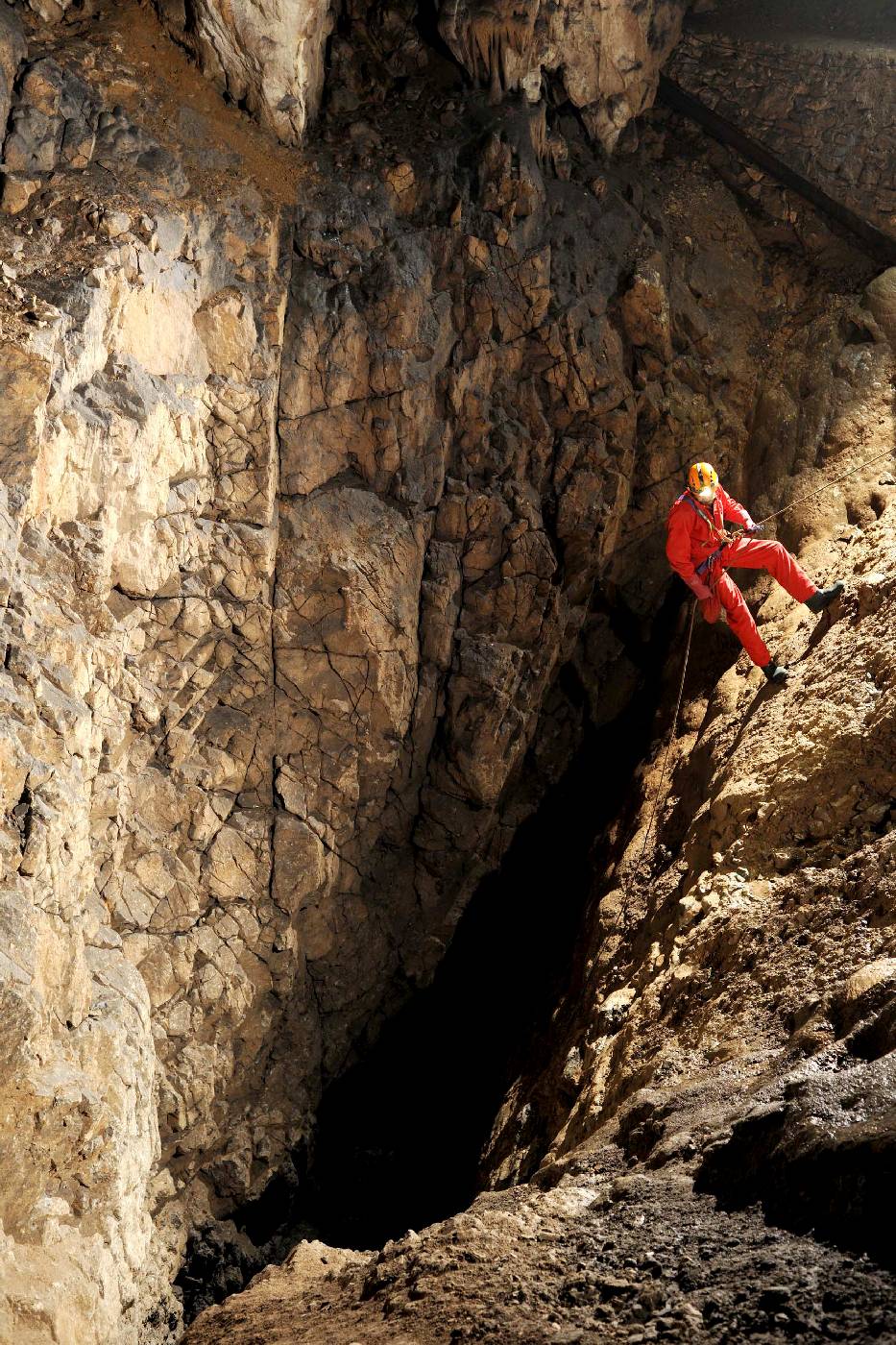 Nejhlubší podzemní propast České republiky – Nagelova propast, vyfotografovaná z tzv. Bočkova okna. Na snímku je vidět Dolní vyhlídkový můstek – součást prohlídky Sloupsko-šošůvských jeskyní