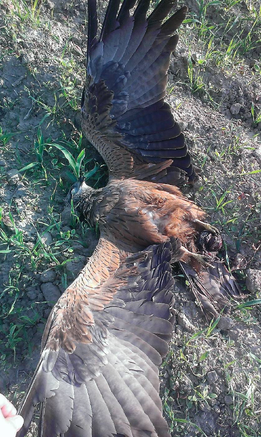 Otrávený luňák hnědý je v typické poloze svědčící o otravě – má roztažená křídla a sevřené pařáty, ve kterých ještě svírá návnadu. Foto: Klára Hlubocká, ČSO