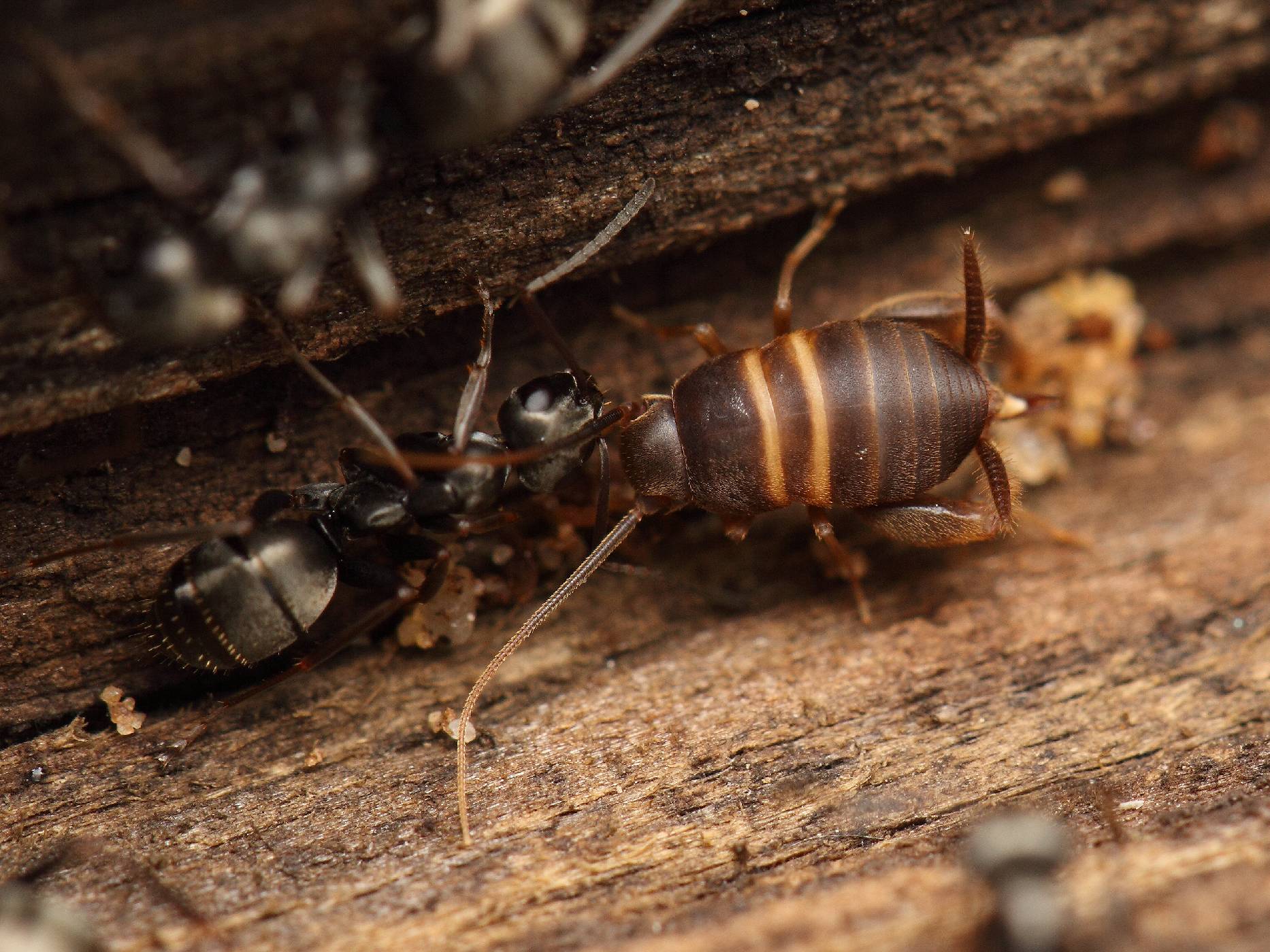Cvrčík při „komunikaci“ s jedním z mravenčích hostitelů. Na tomto snímku jsou dobře patrné štěty na cvrčkově zadečku.