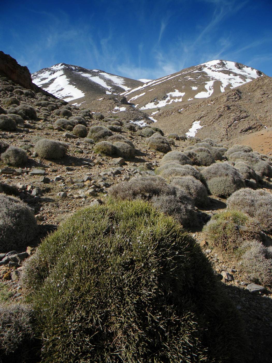 Trsy pryšců a keřů Retama provázejí bloudění na cestě pod masiv Ayachi