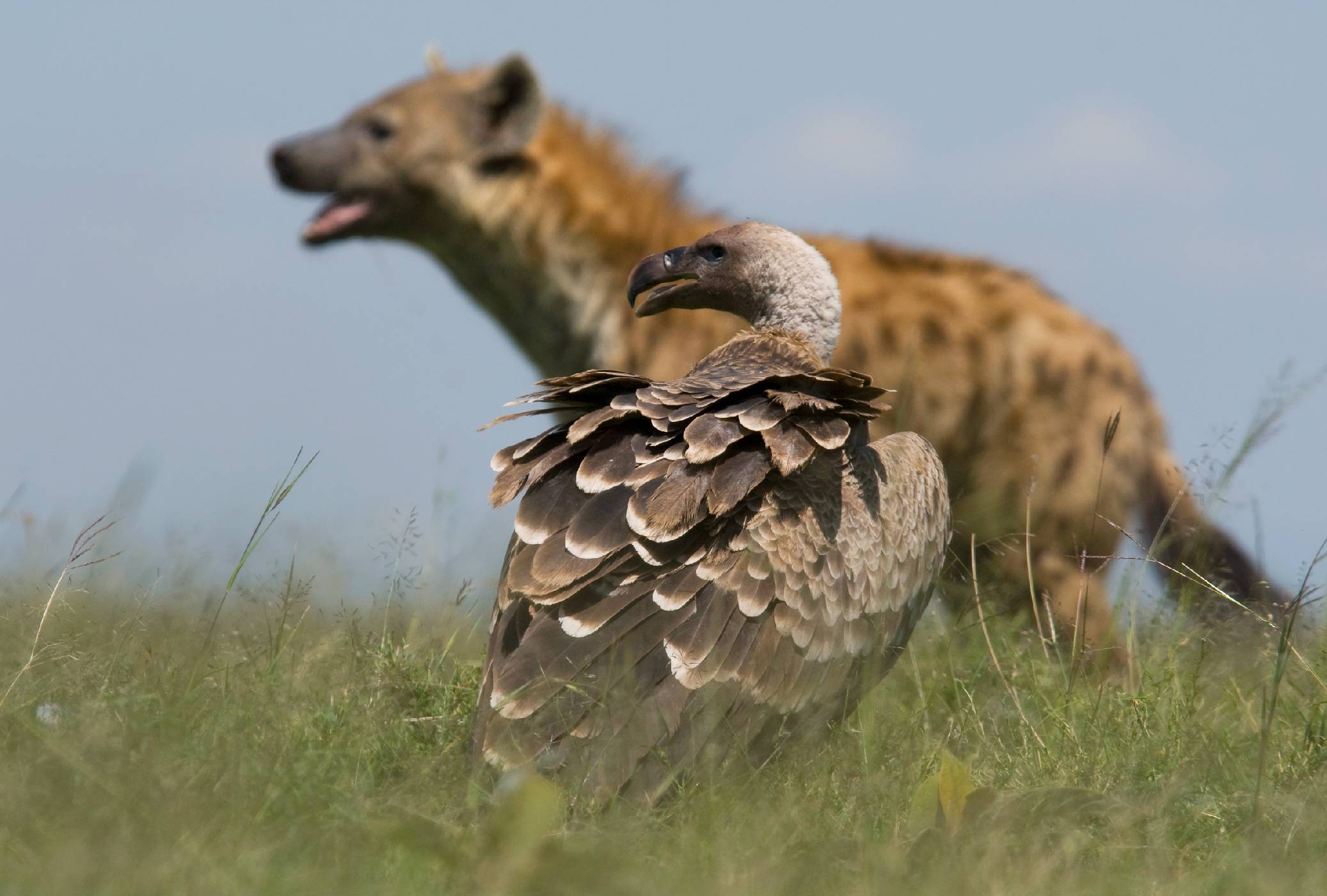 Hyeny svůj úlovek před ostatními predátory srdnatě brání. Supy však odhánějí od kořisti s respektem a opatrně. Tito statní mrchožrouti totiž mohou zobany a pařáty připravit neopatrnou hyenu o zrak. (foto: Shutterstock)