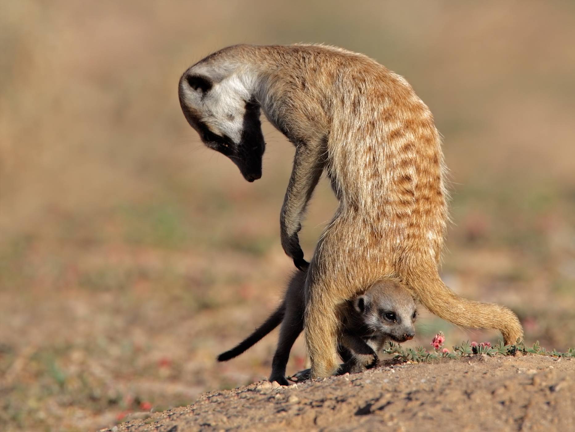 Péči o mláďata u surikat zajišťují nejen rodiče, ale i ostatní členové kolonie, kterým se říká pomocníci