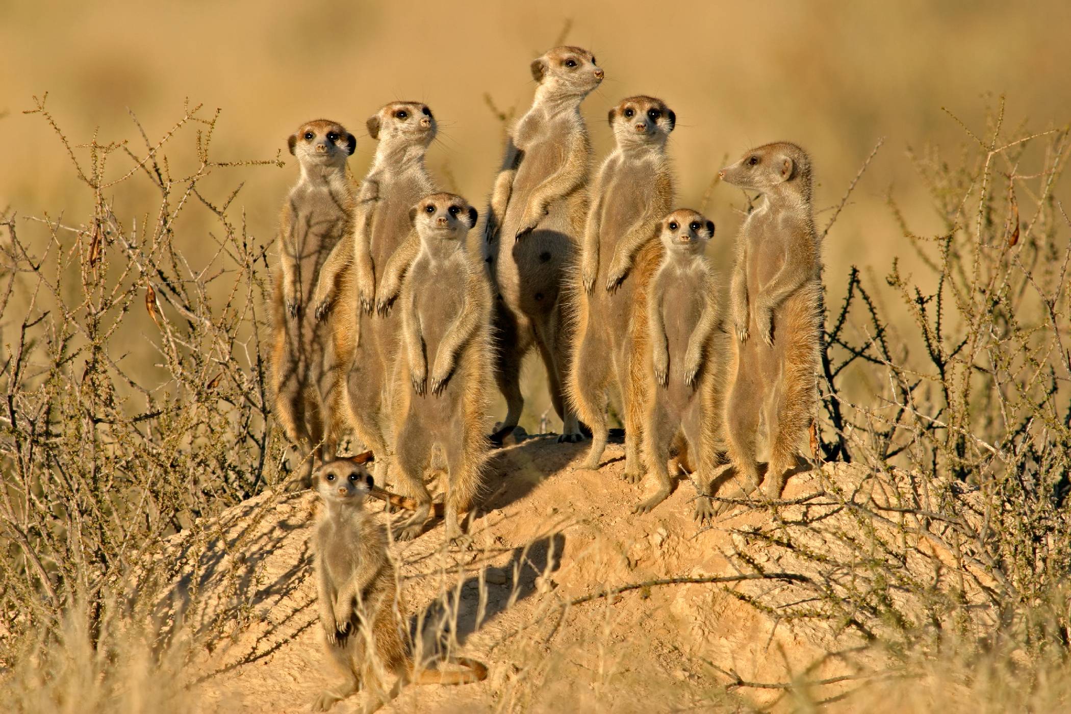 Surikaty žijí ve skupinách zhruba o dvaceti členech, ale některé kolonie mají i padesát jedinců
