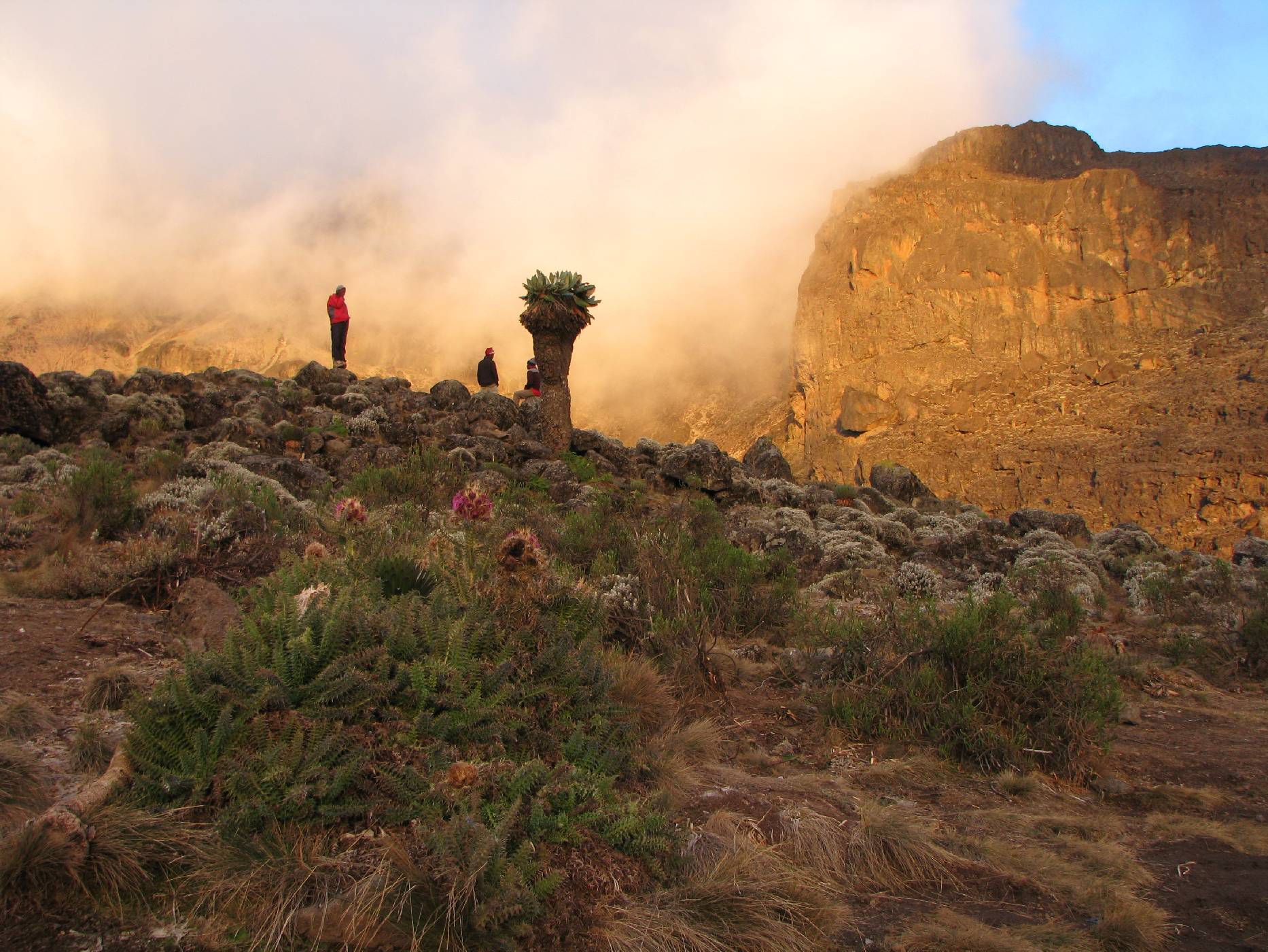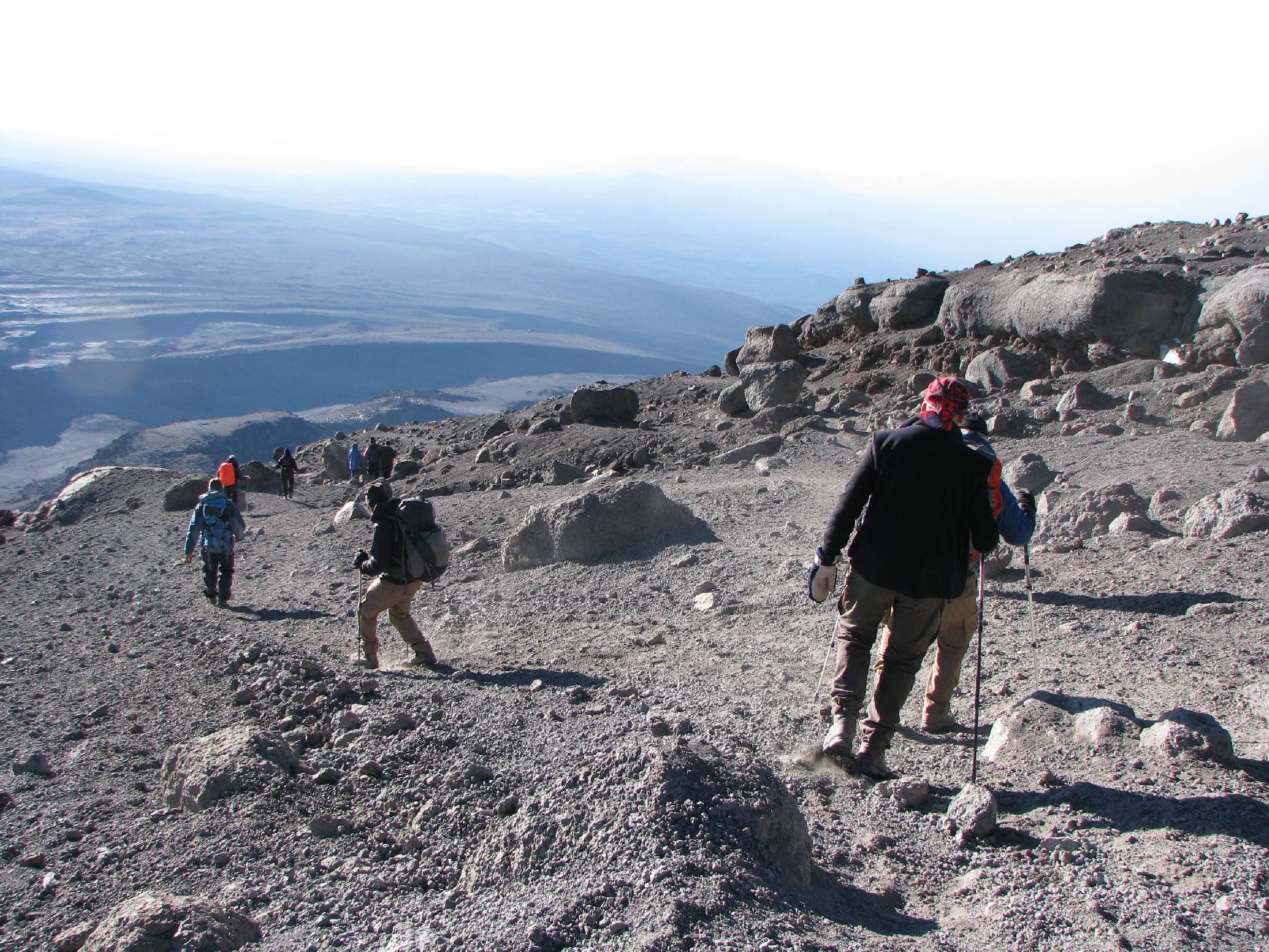 Cesta nahoru bývá v této části při nočním výstupu zmrzlá a lávová suť drží poměrně pevně pohromadě. Návrat sutí, která se ve slunečních paprscích sype pod nohama, je pak poměrně rychlý