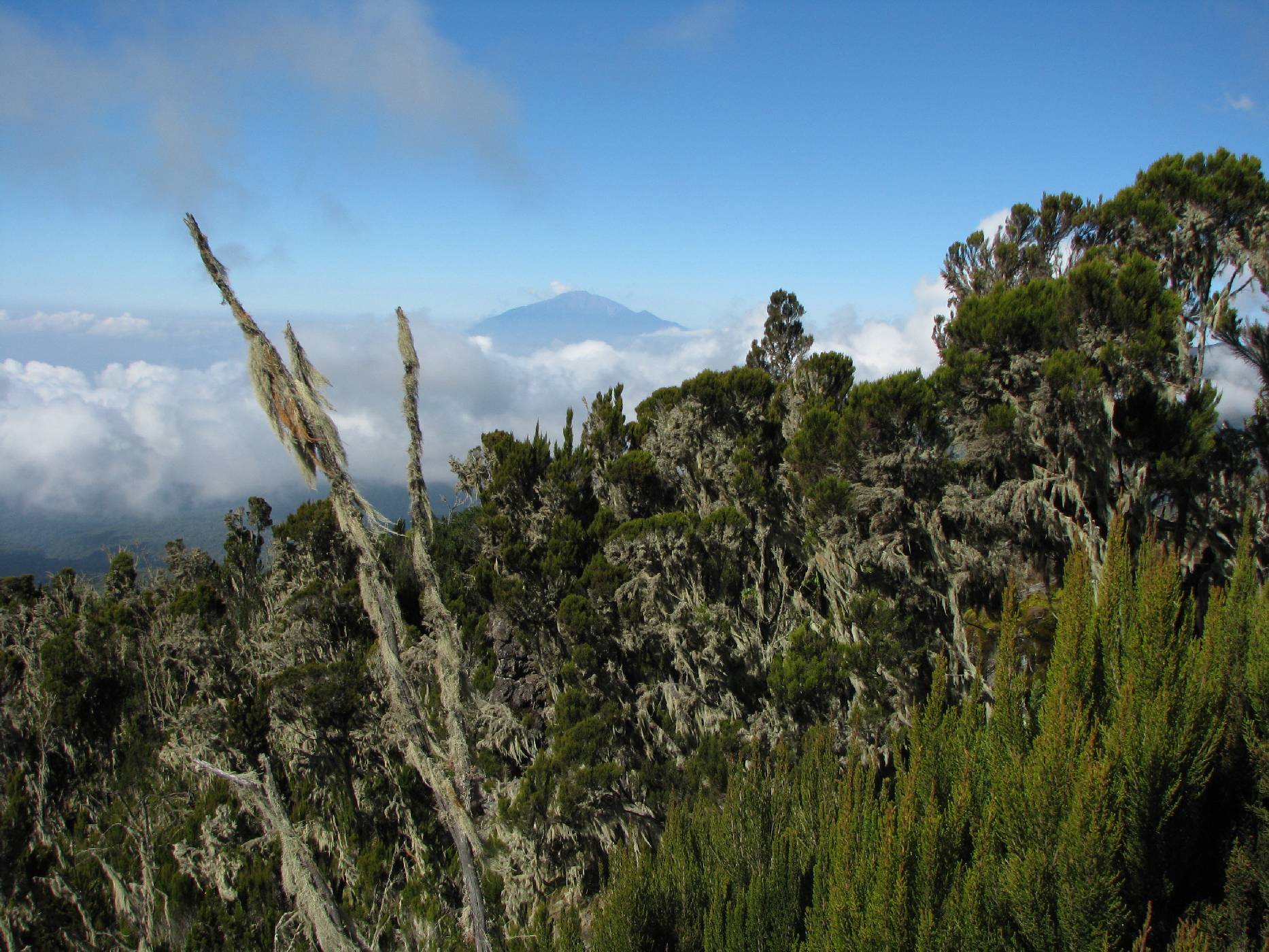 Deštný prales ve výšce kolem 2 500 metrů je hojně porostlý epifytními lišejníky, kterým se říká „plnovous starého muže“. V pozadí je vidět sopka Mount Meru – druhý nejvyšší vrchol Tanzanie