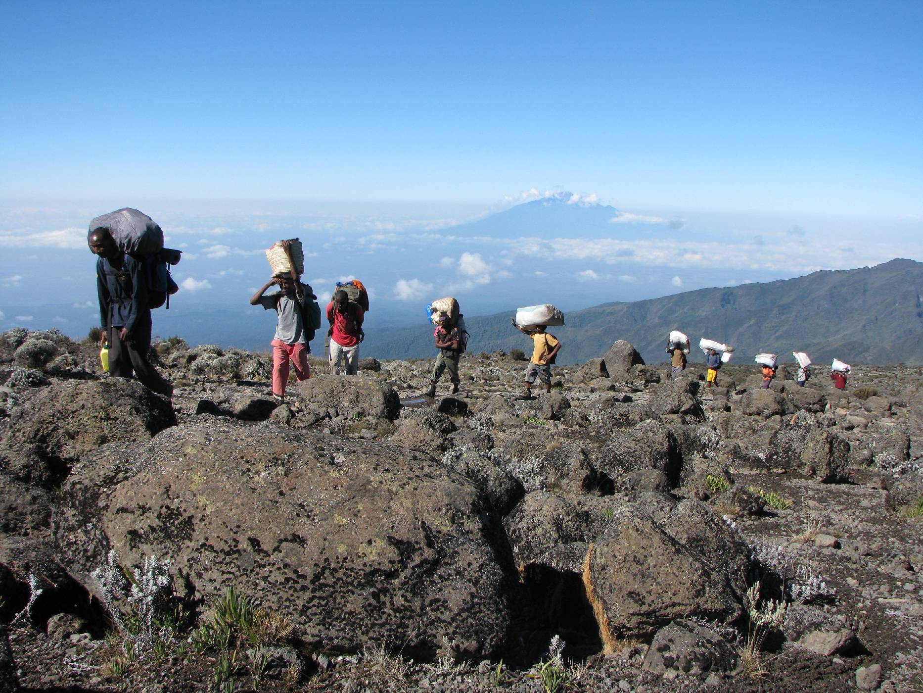 Řetěz tanzanských nosičů ve výšce kolem 4 000 metrů. Pokud mají štěstí, absolvují tito lidé cestu do vrcholového tábora asi desetkrát za rok a zajistí tak podstatné vylepšení rodinného rozpočtu