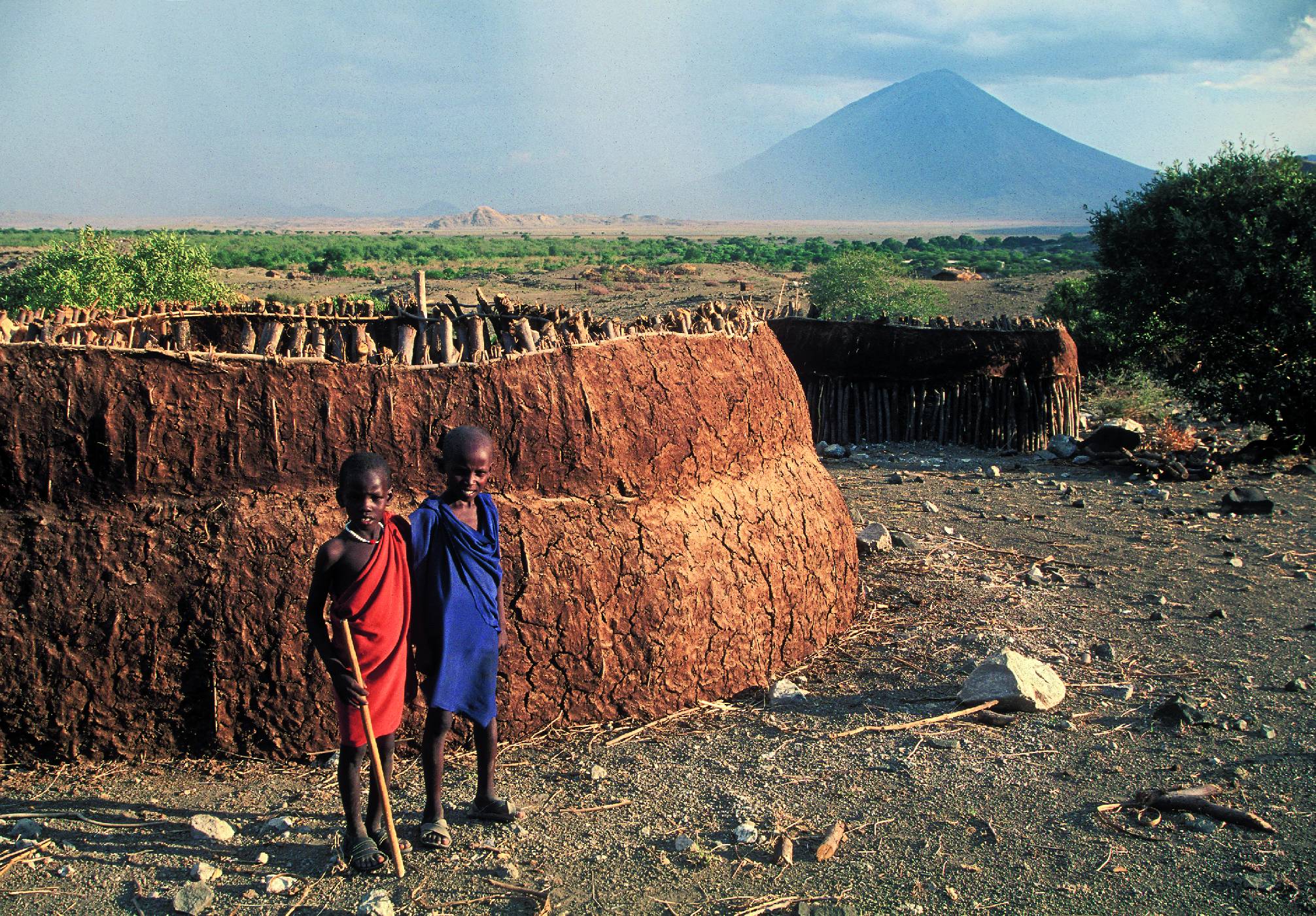 Děti u rozestavěné chýše manyaty, kterou tvoří spletené klacky vymazané směsí hlíny a kravského hnoje. V pozadí sopka Oldoinyo Lengai