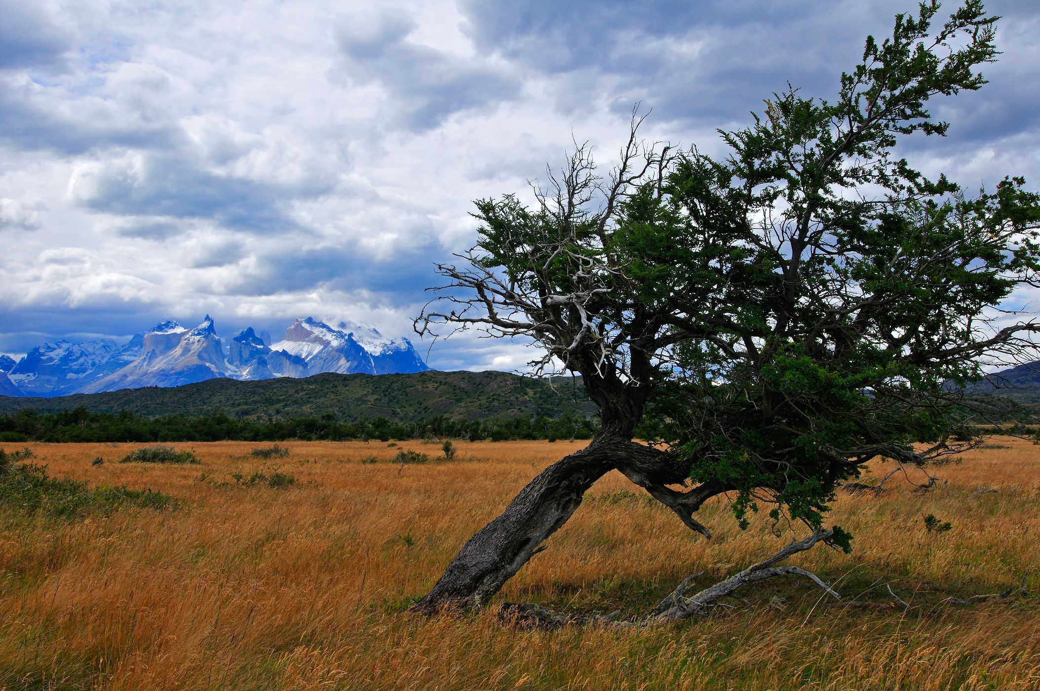 Krajina na jihu Patagonie je bičovaná silnými neutuchajícími větry, o čemž svědčí i tento k zemi skloněný strom, který musí náporům neustále čelit